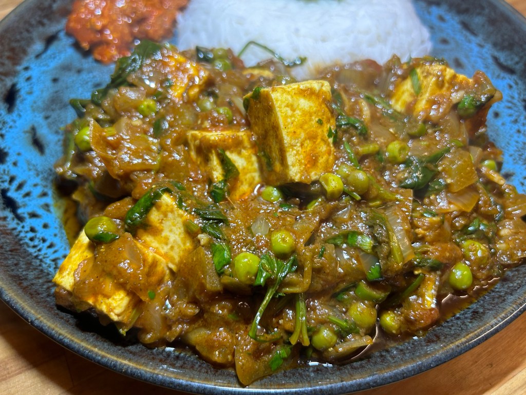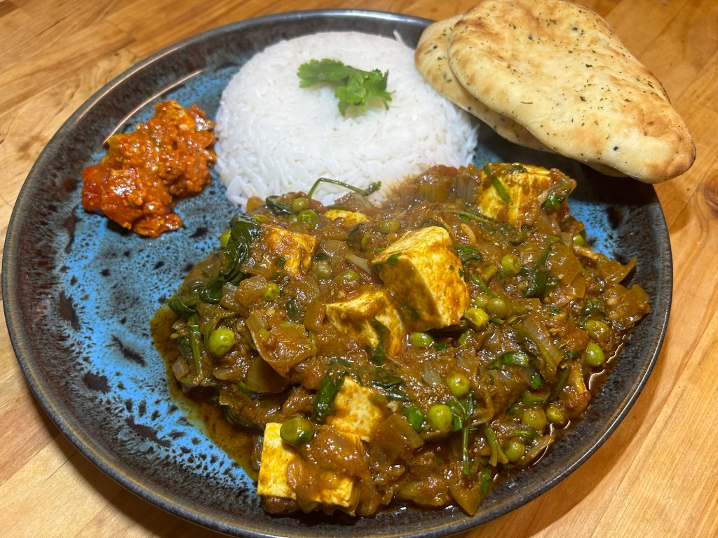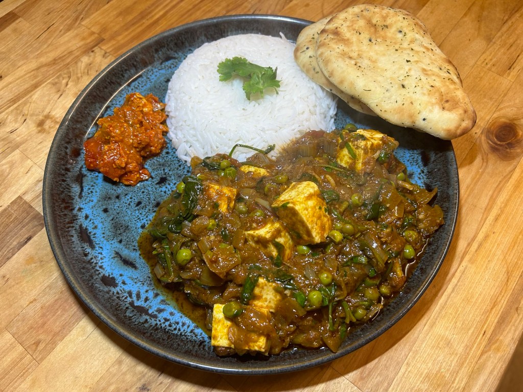 I served the paneer curry with the steamed rice along with some homemade pickle from a work colleague and a couple of shop bought breads.