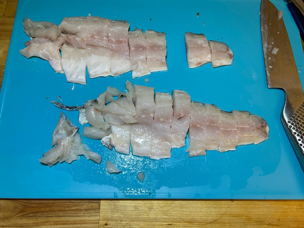 Slice your fish with skin on into 2cm strips.