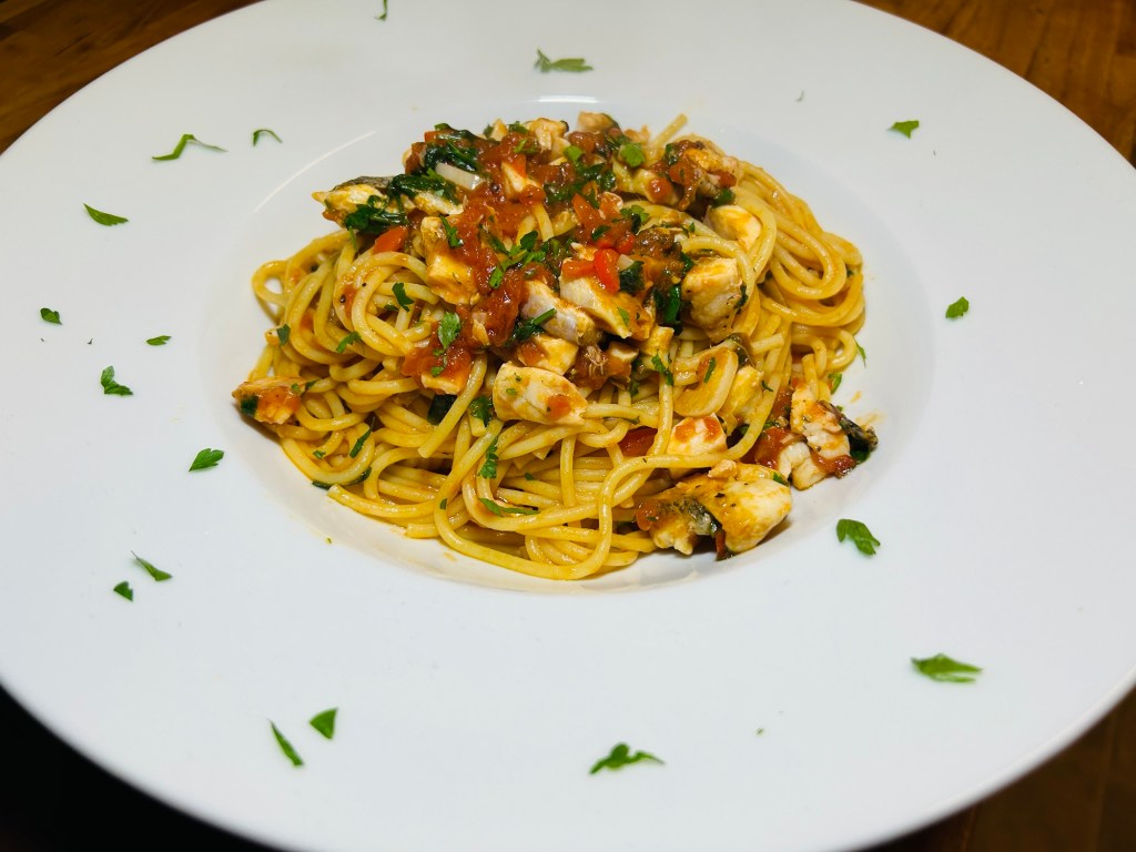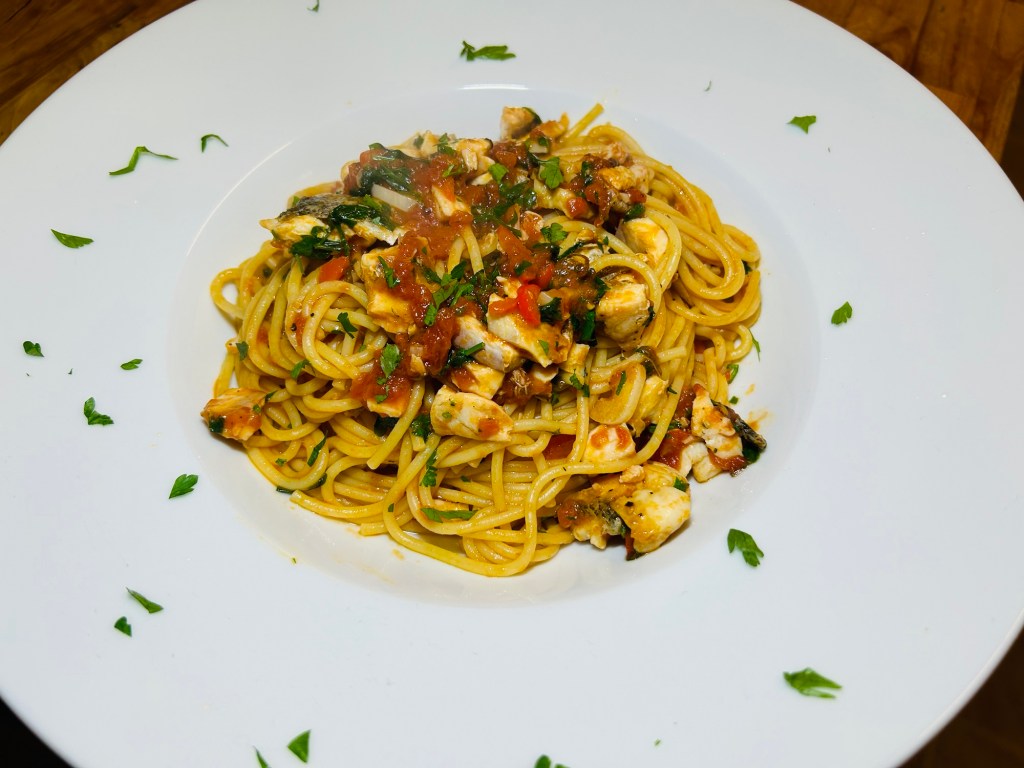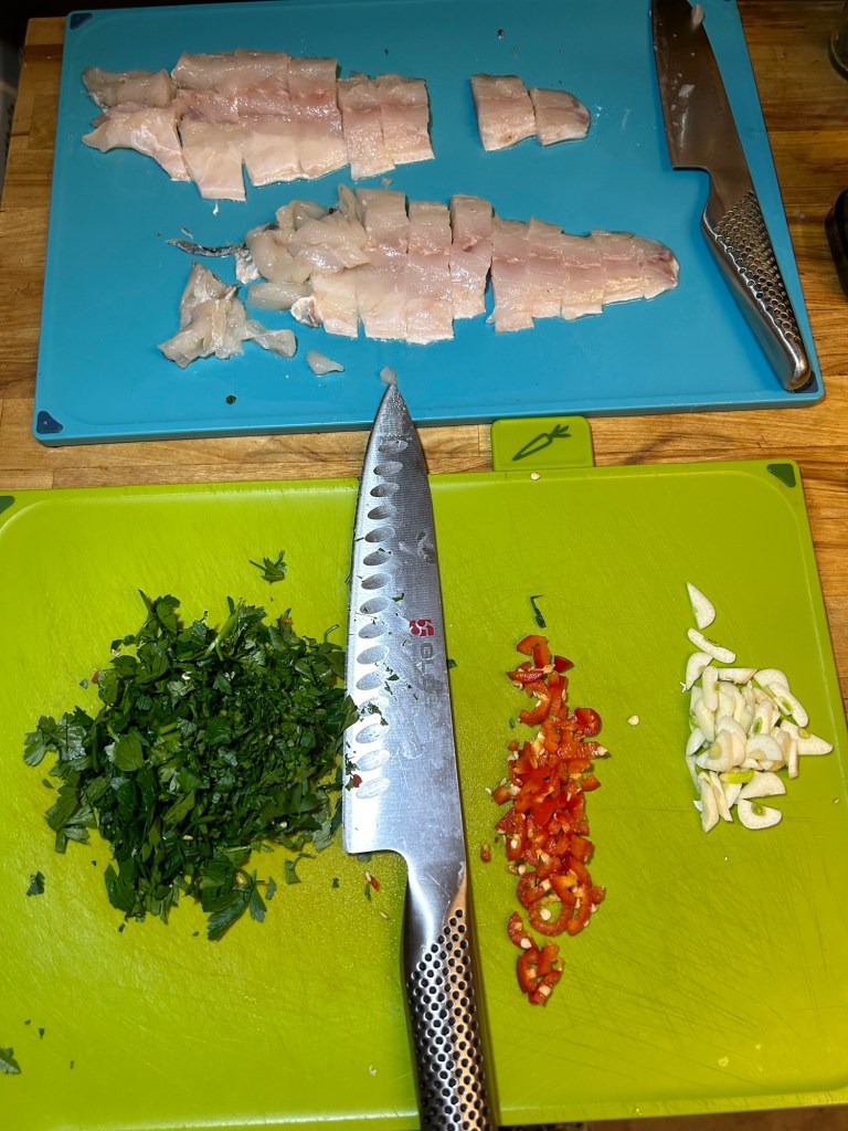 I’ve taken inspiration from the recent visit and taken a recipe from Rick Stein and modified to suit myself to bring together the two areas I want to improve on – seafood and pasta.
