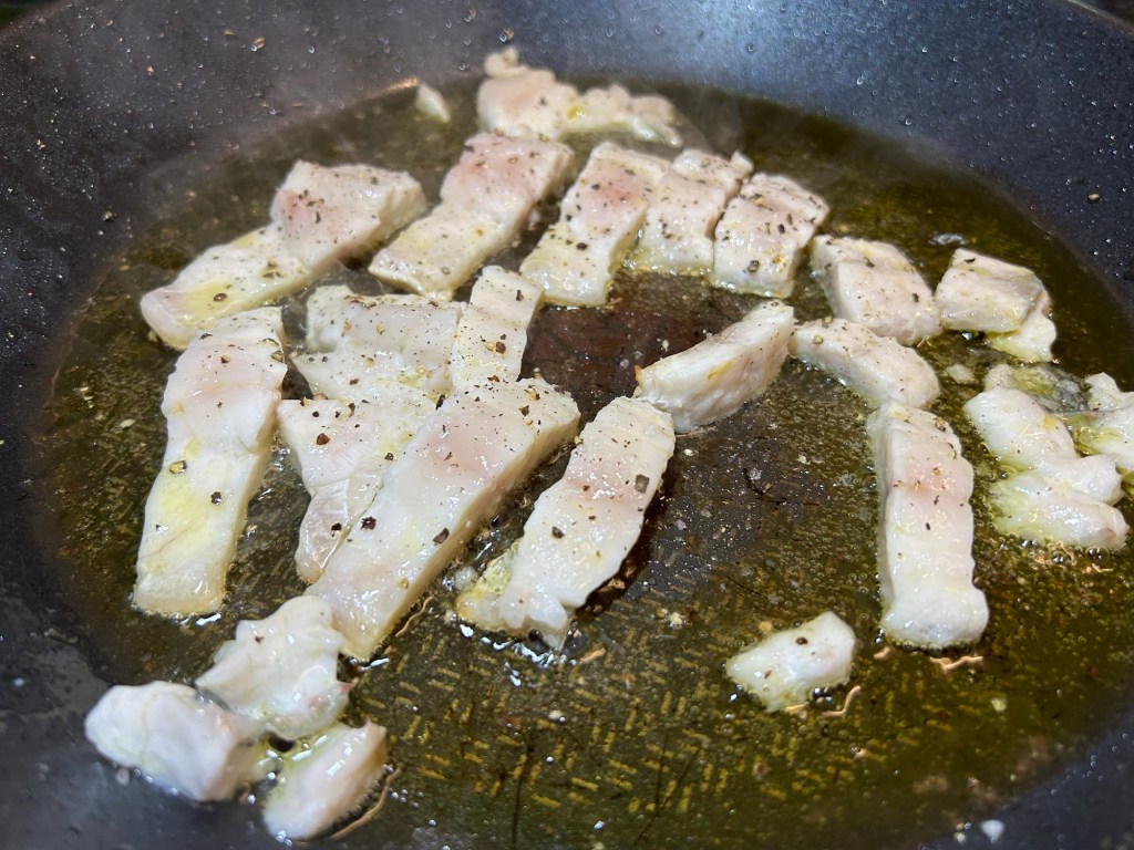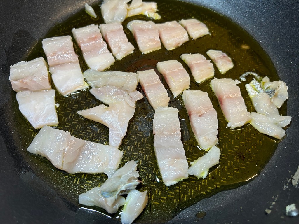 Heat the olive oil in a large pan. Add the spaghetti to your boiling water. Place your fish strips in the olive oil skin side down. Fry the fish for 3 / 4 minutes.