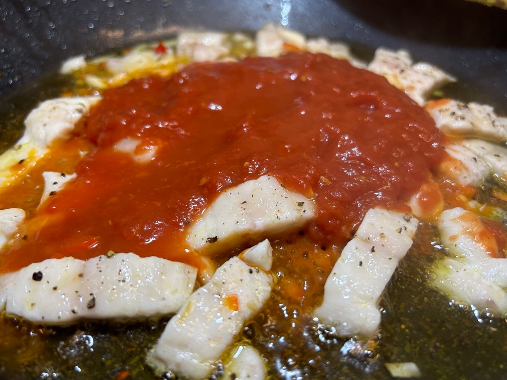 Follow the chilli and garlic with the chopped tomatoes, leave this for a minute.