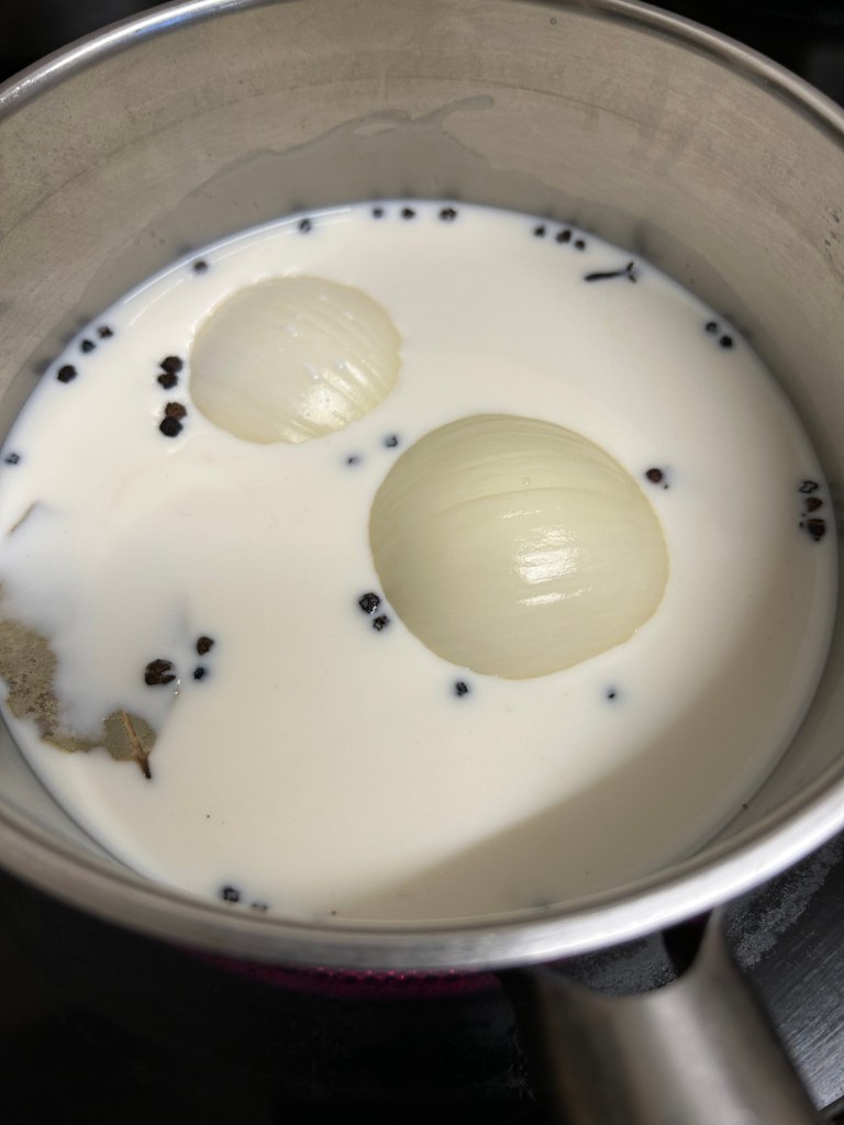 Place the onion halves in a pan with the milk, bay leaf, cloves and peppercorns. Bring this to the boil then remove from the heat and set aside for 20 minutes to infuse the milk.
