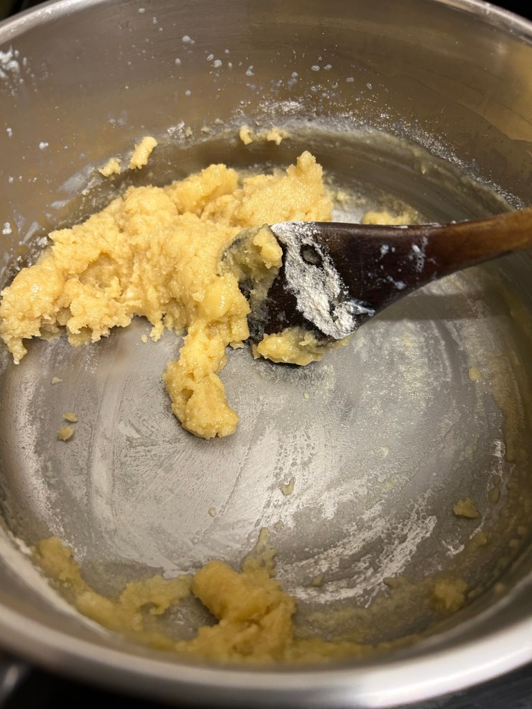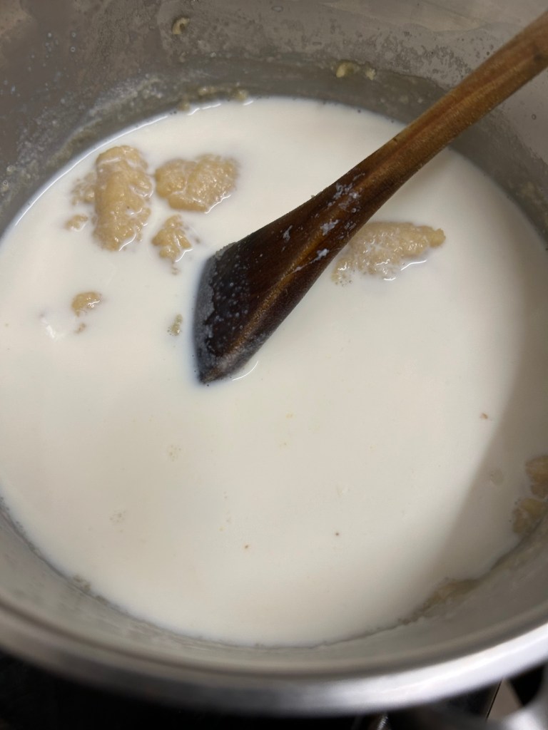 Remove the pan from the heat. Add in the milk and whisk to break down the roux creating the white sauce.