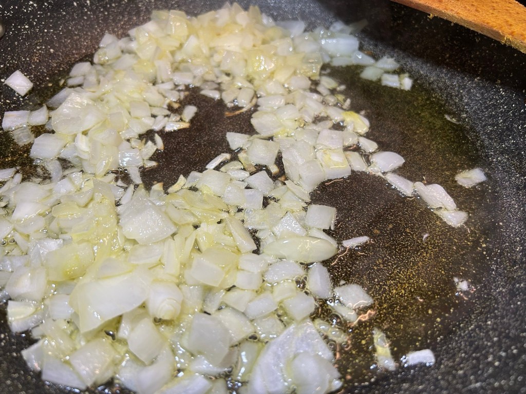 As always…..heat half of the oil in the pan. Once the oil is hot add in the finely chopped onion. Fry the onion the 5 minutes or so until it’s nice and translucent.