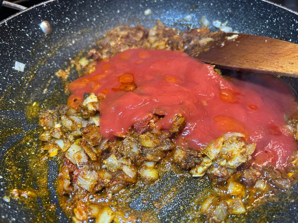 Followed by the passata. Bring the passata to a simmer mixing all the ingredients together around the pan. At this stage the kitchen will smell amazing.