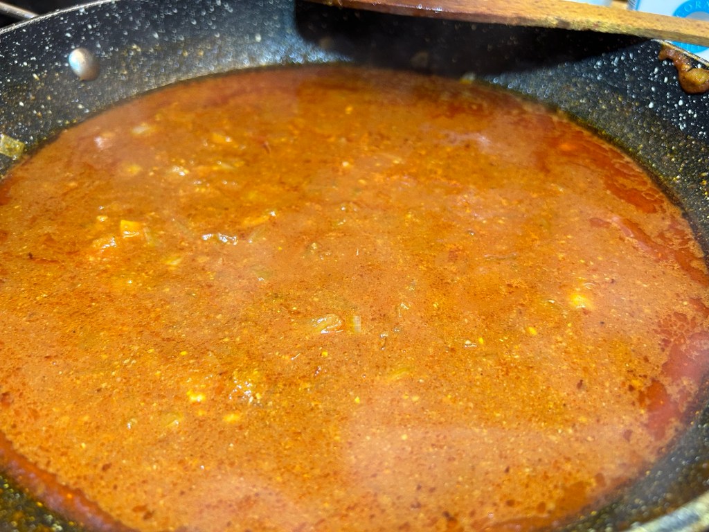 Add back in your blended sauce plus the reserved chicken stock. Bring this to a simmer.