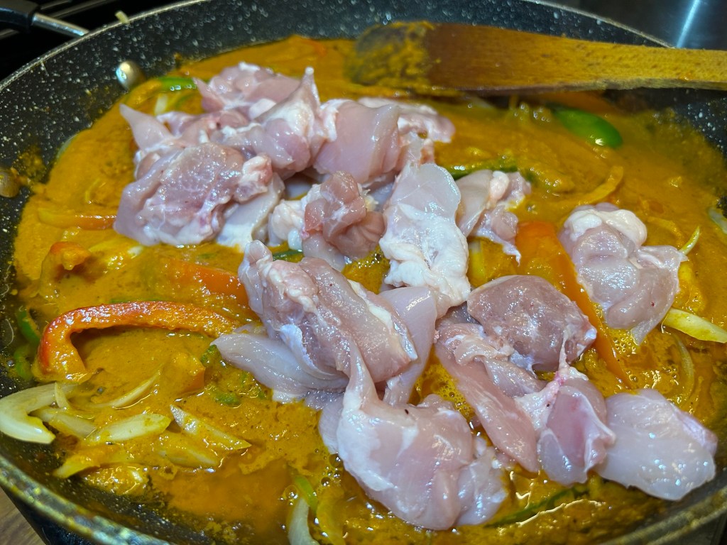 Place your raw chicken evenly in the sauce mix. Coat the chicken and leave to cook for 10 minutes ensuring the chicken is cooked all the way through. The smaller you’ve cut your chicken the quicker it will cook.