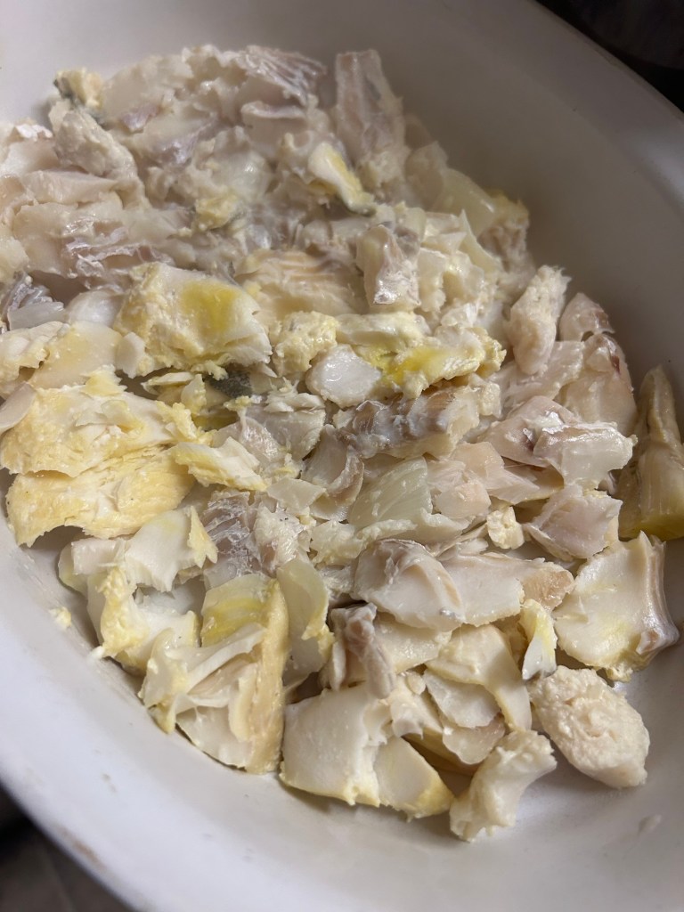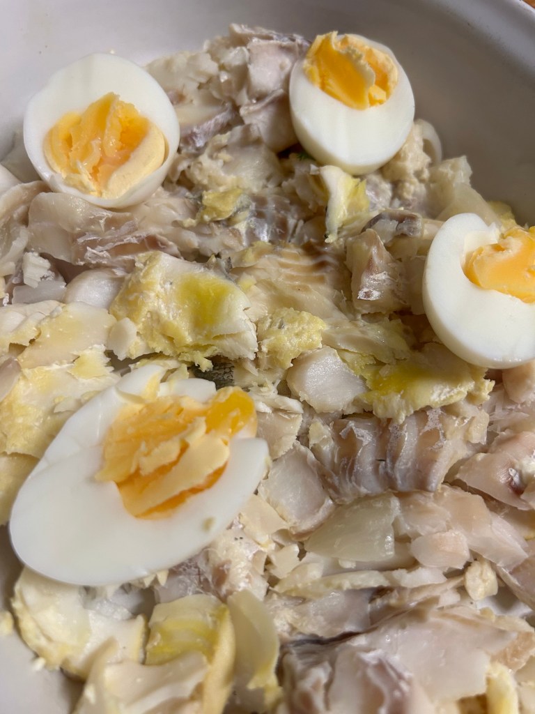 Peel the boiled eggs then cut into half’s. Place on top of the flaked fish.