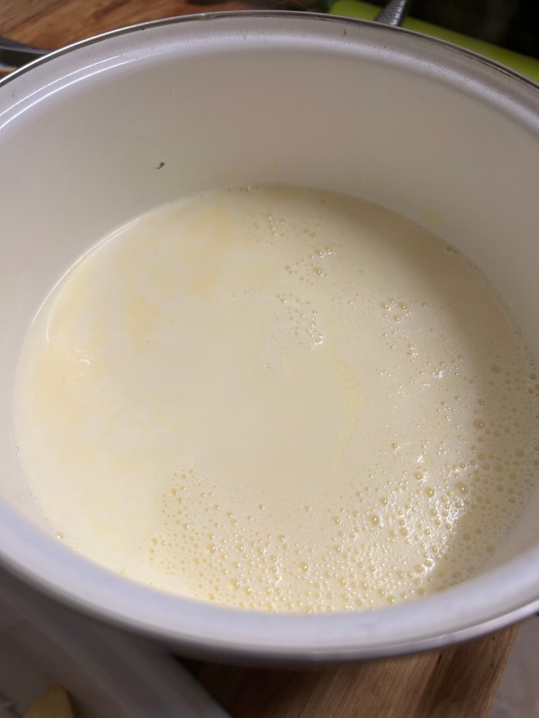 Stud a couple of the onion slices with the cloves. Put the onion slices in a large pan with the bay leaf, 450ml of the whole milk, cream along with the fish. Bring to the boil and simmer for 8 minutes.