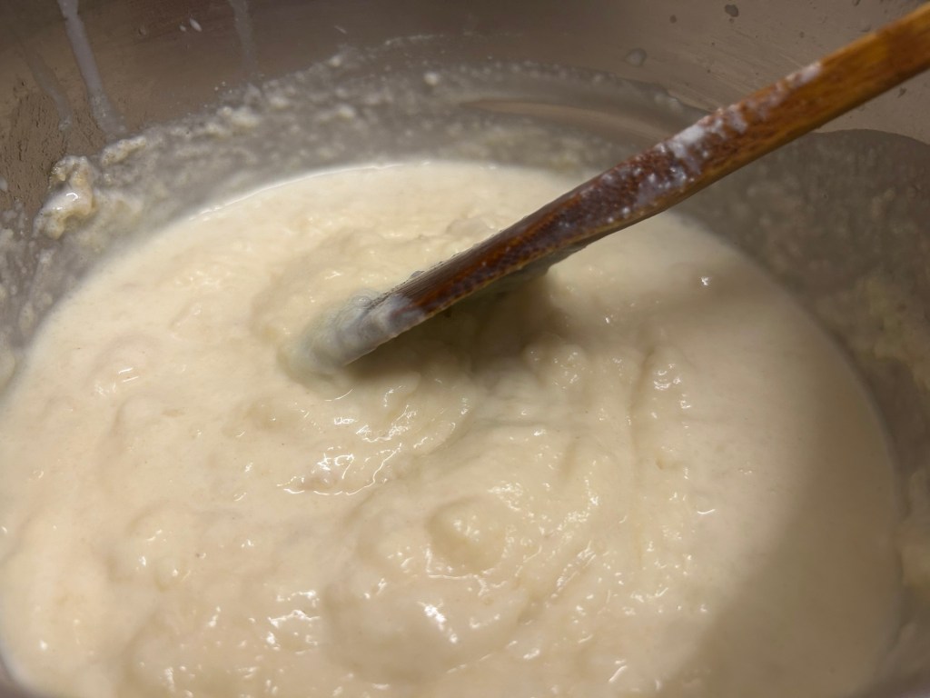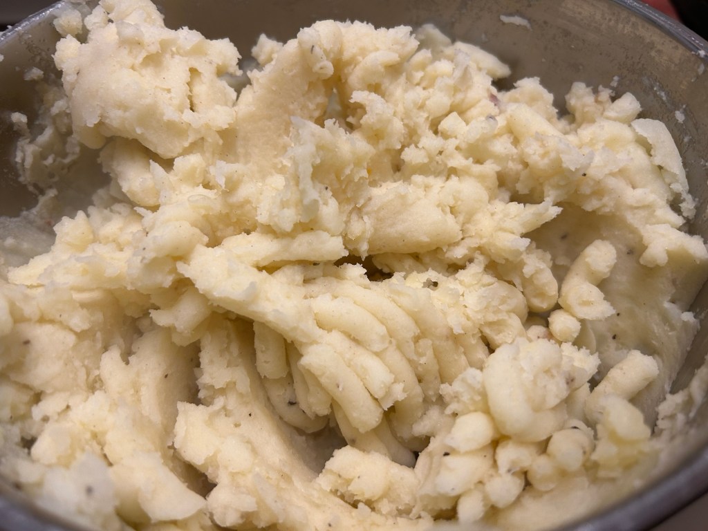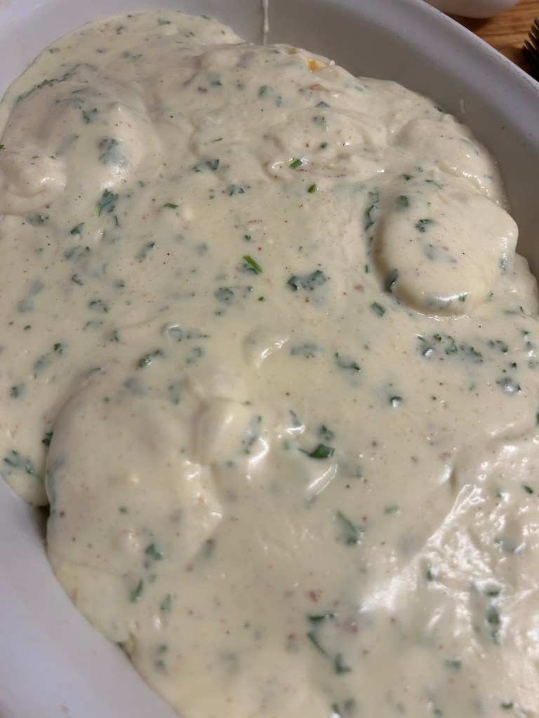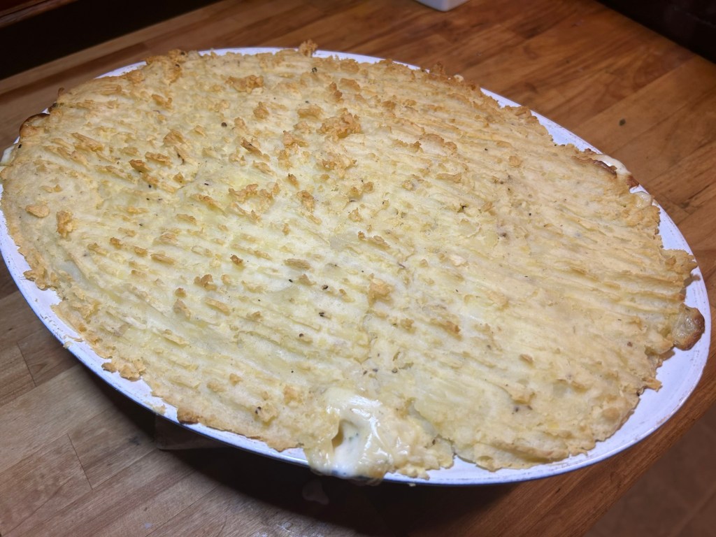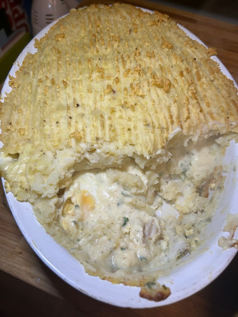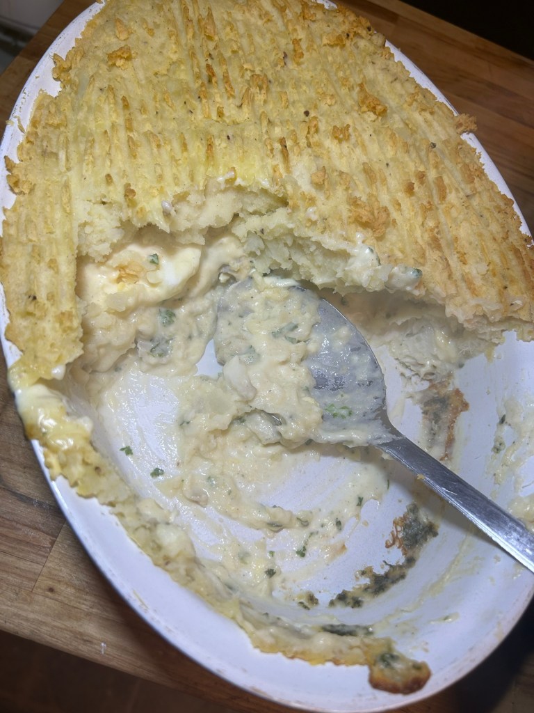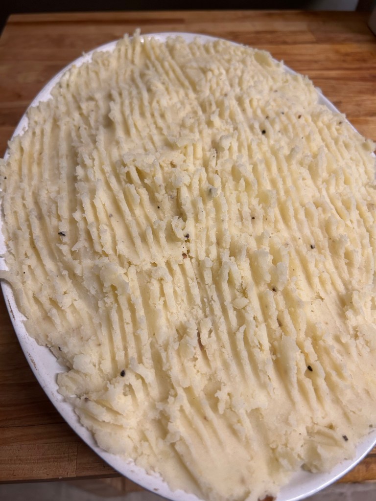 Place the mashed potato on top of the white sauce. I ran a fork across the top of the mash just to be ‘arty’ but that’s just me.