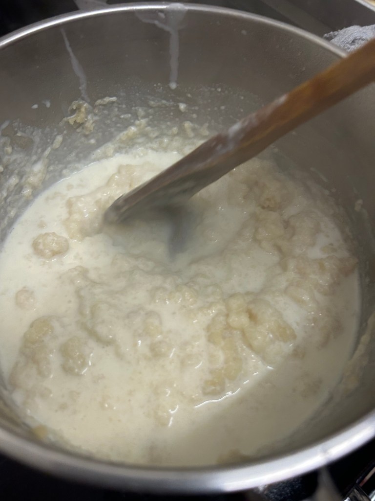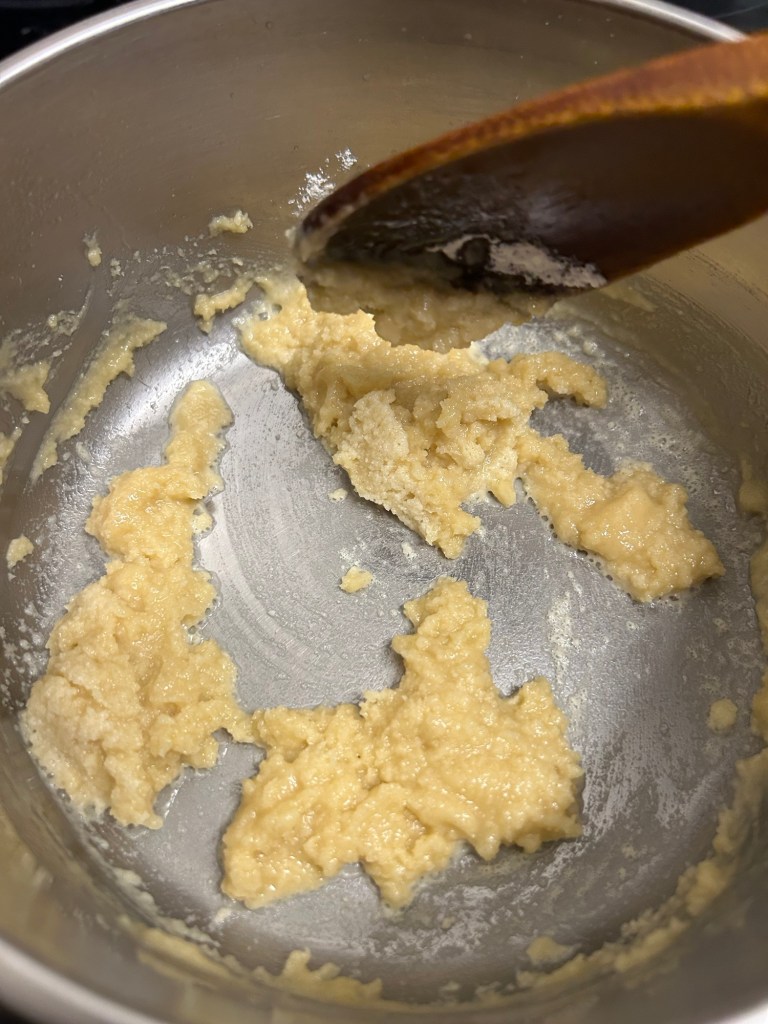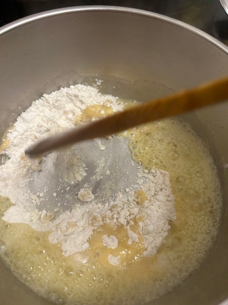 Put the pan back onto the heat. Stir well and cook the flour out for 10 minutes or so.