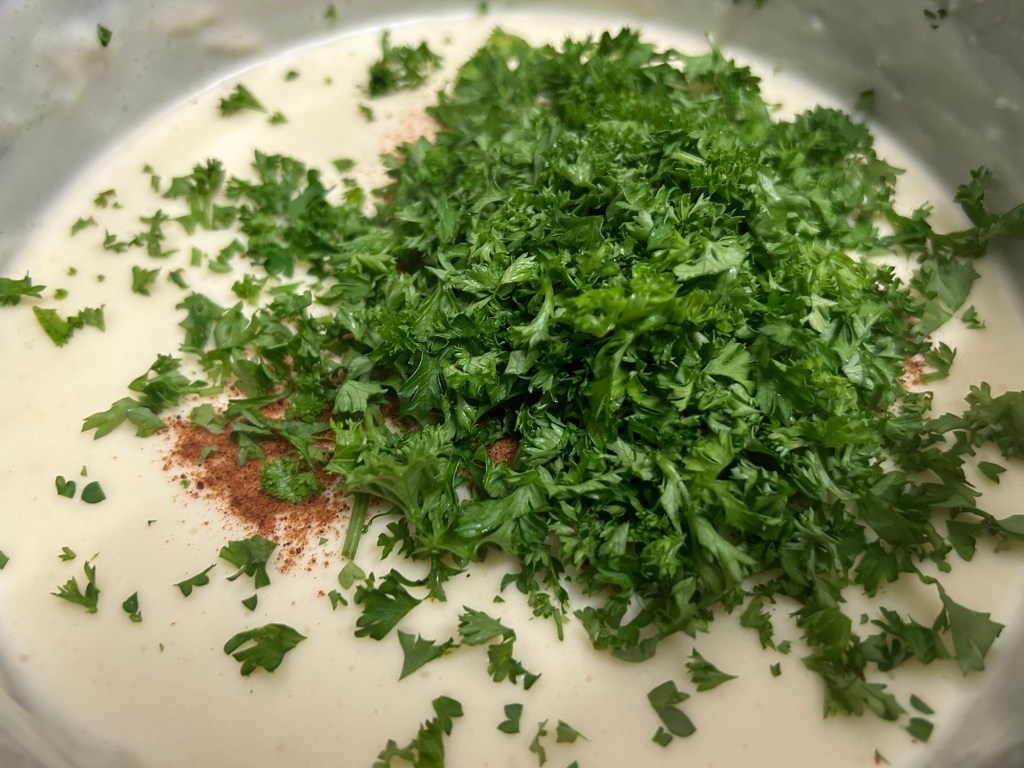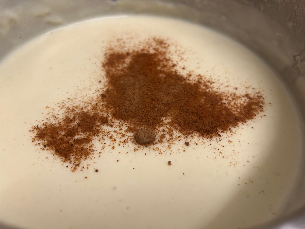 The sauce will naturally thicken. After the 10 minutes remove the pan from the heat. Add in the ground nutmeg……