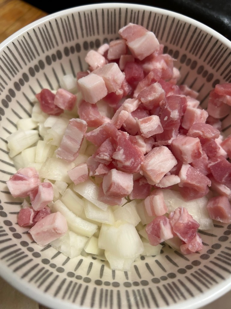 Mix the bacon lardons and diced onion together in a small bowl.