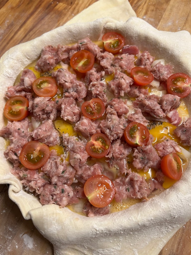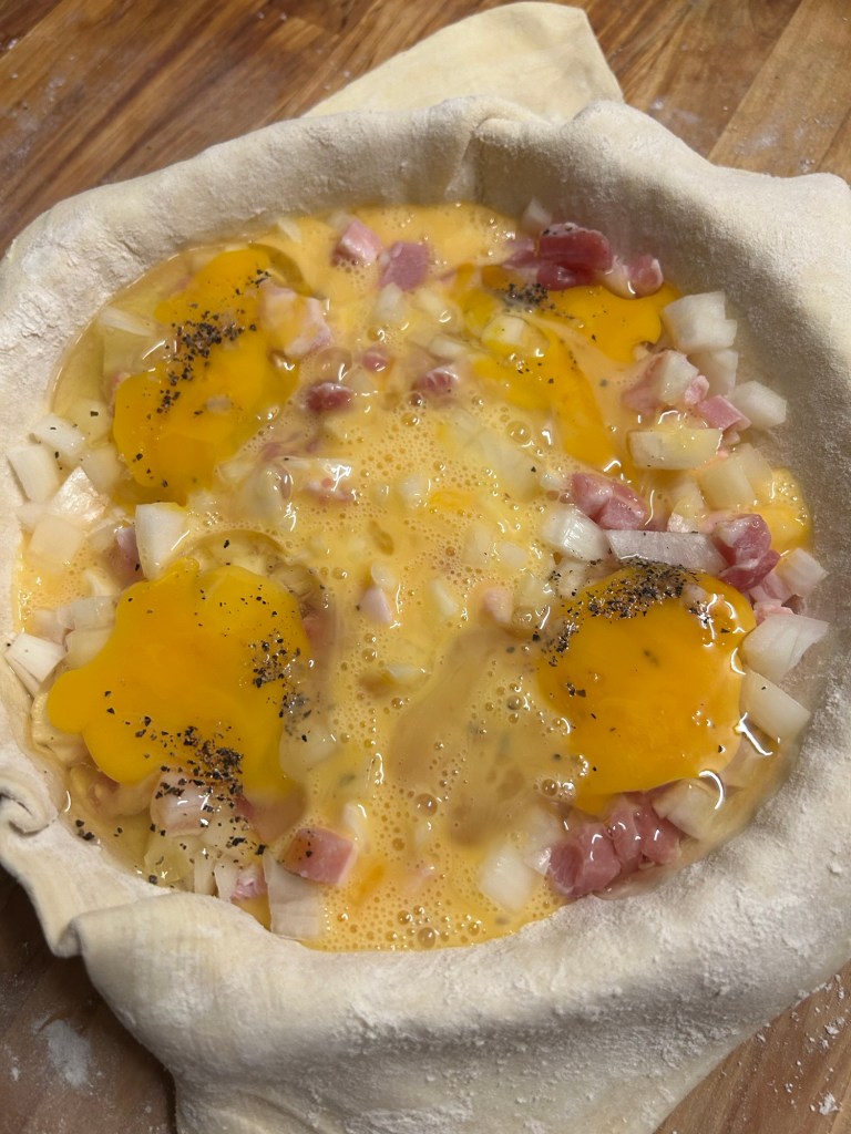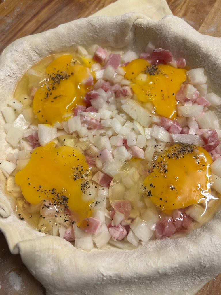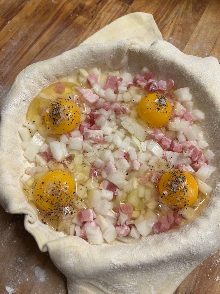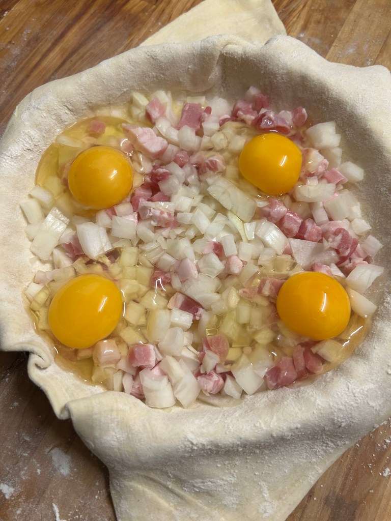 Place the onion and bacon lardons mix into the pastry case.