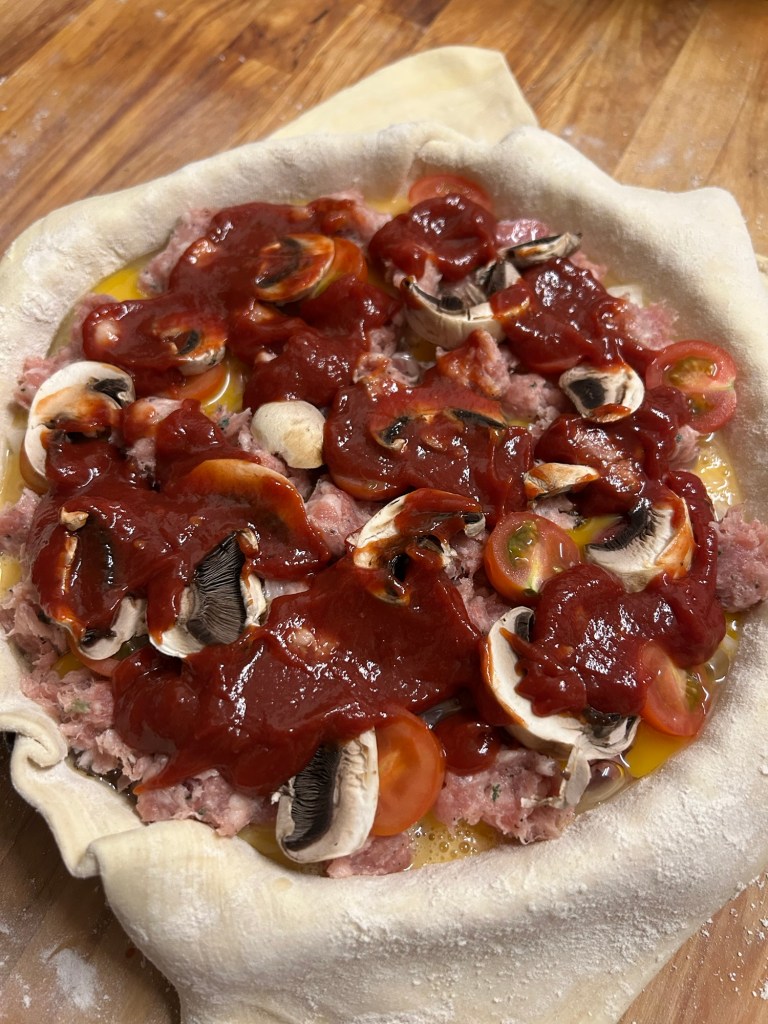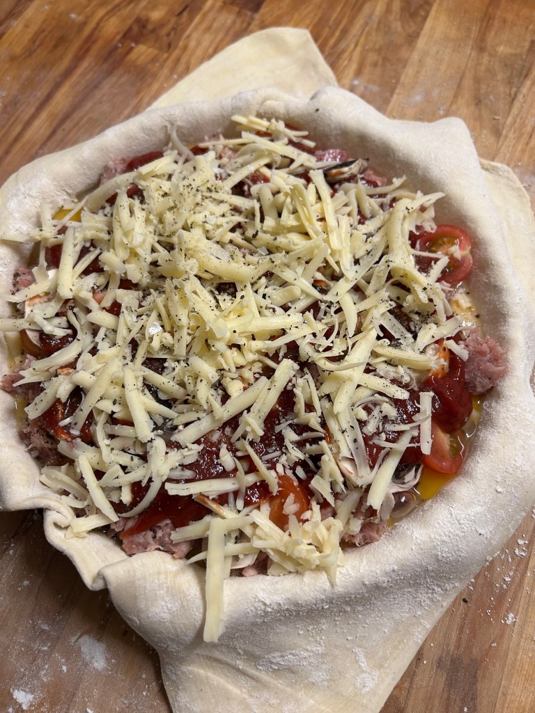 Place the pie tin on the preheated baking tray and cook in the oven for 30 / 35 minutes. The pie will be lovely and golden.