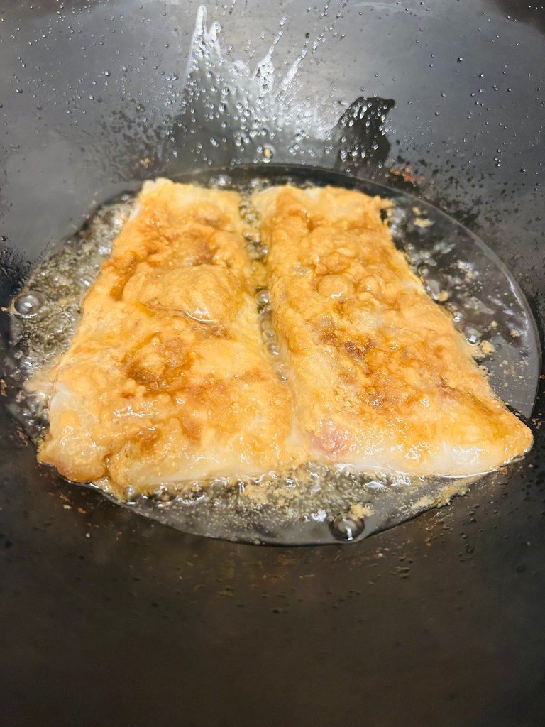 Heat 2 tbsp of vegetable oil in a wok or large pan. Once the oil is nice and hot add in the cod fillets gently. They will spit at first so please be careful when placing these in the hot oil. Fry these for 2 / 3 minutes then gently turn them over and repeat the process. The edges will caramelise with the marinade. Once you are happy with the cooking gently remove them from the hot oil and place on a plate.
