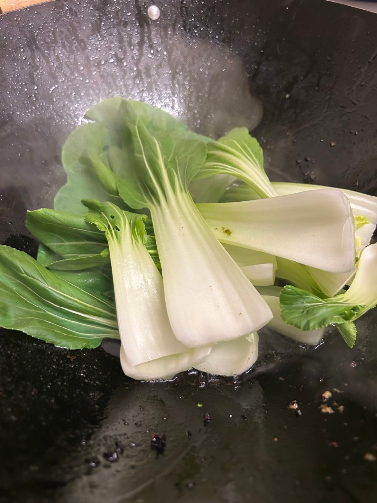 Put a pan of cold water, bring to the boil and cook your noodles as per the packet instructions. Once they are cooked remove and drain from the water placing them in your serving bowls. Whilst the noodles are cooking add a little more oil into your wok or flat pan. Once the oil is hot add in your pak choi. Stir fry until the leaves start to wilt a little.