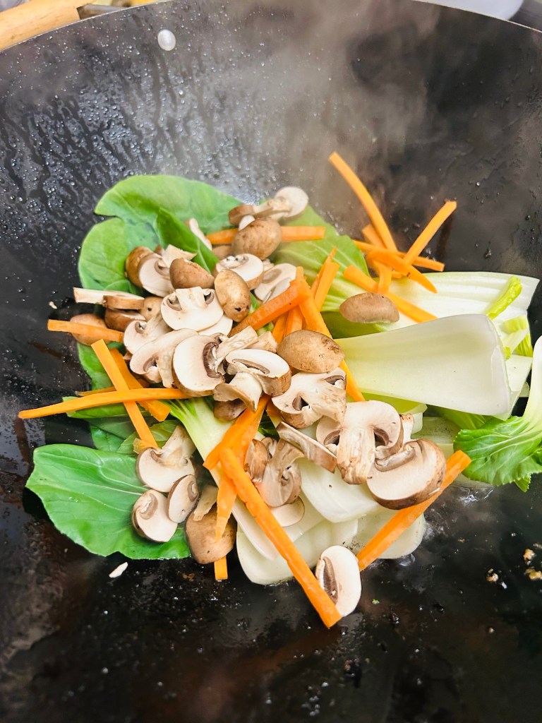 Add in your the diced carrots and chestnut mushrooms. Let these stir fry for a moment.
