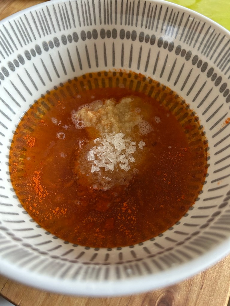 Taking all the ingredients of the first marinade – chilli powder, salt, rapeseed oil, lemon juice and garlic and ginger paste placing them all in a bowl. Whisk them all together.