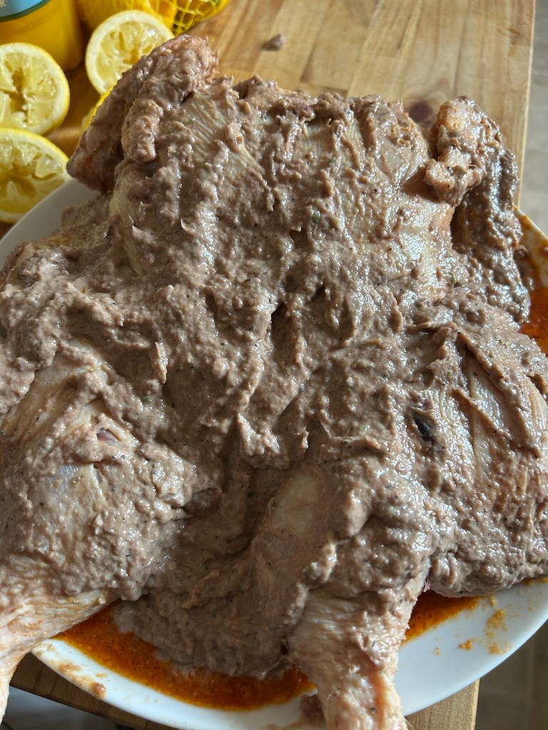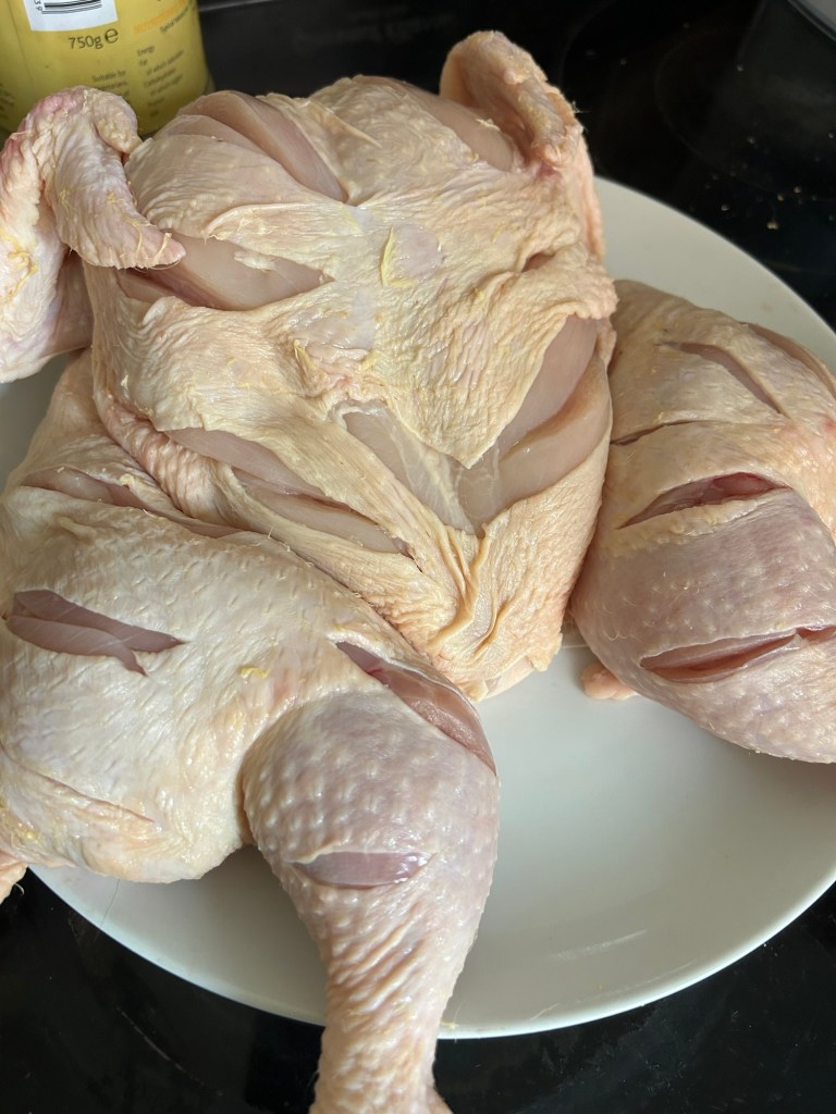 Cover the whole chicken in this paste, and again ensuring the bird is covered all over. Make sure all the slits are full of the paste.