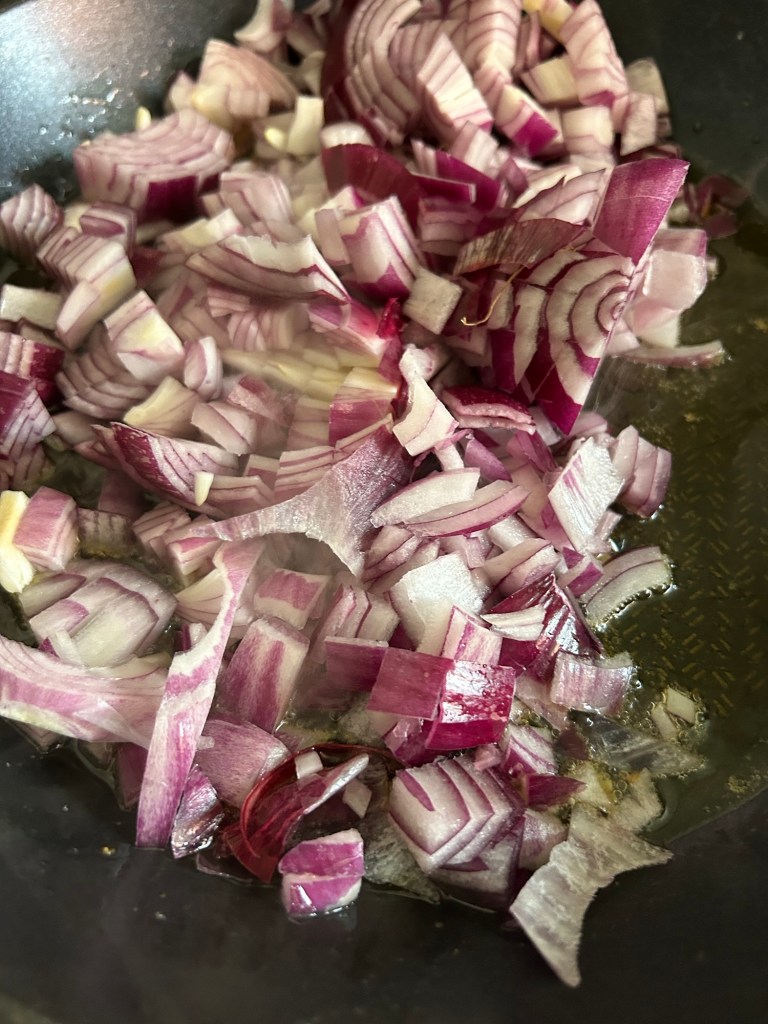 Fry the onions for 10 minutes or so. The onions will become nice and soft and take on the flavours of the ghee. Preheat your oven to 180 / 190 if youāre using the oven.