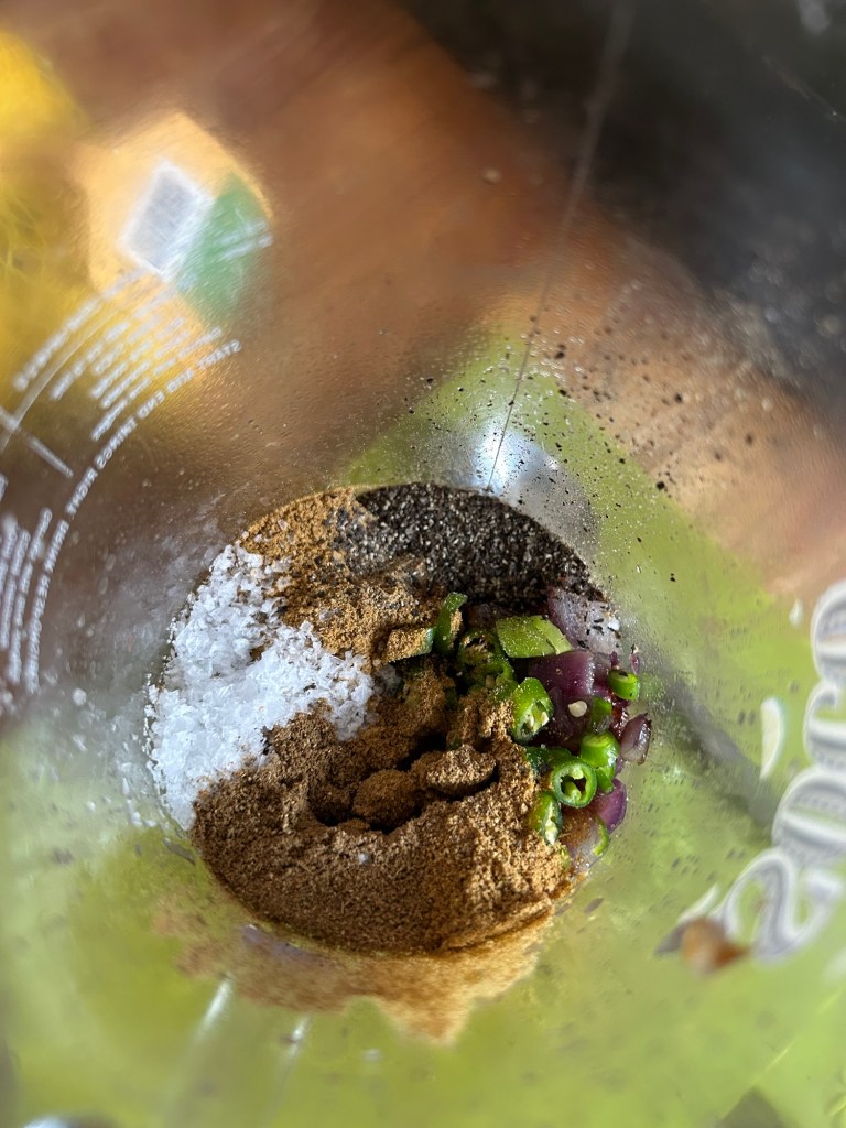 Once the onions have caramelised and browned, remove them from the heat. Add them to a blender. Add in the chillies, cumin, salt, black pepper and garam masala. Blitz this to form a paste.