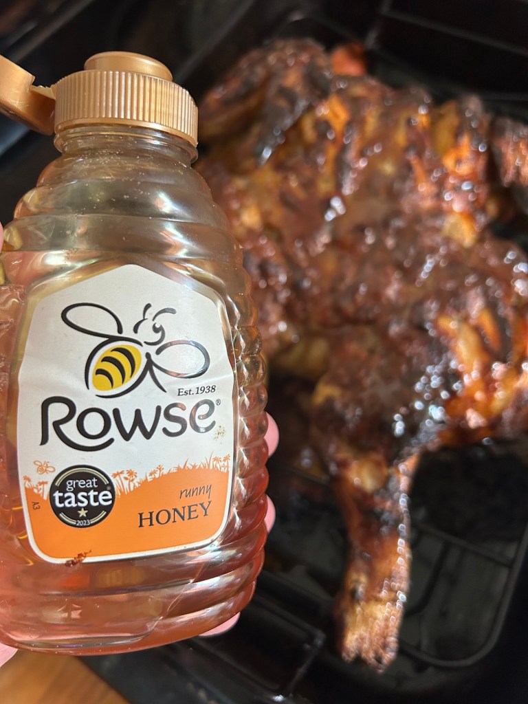 I cooked this for 1 hour and 30 minutes. The chicken was removed from the over and then coated with the honey then placed back in the oven for the final 30 minutes.