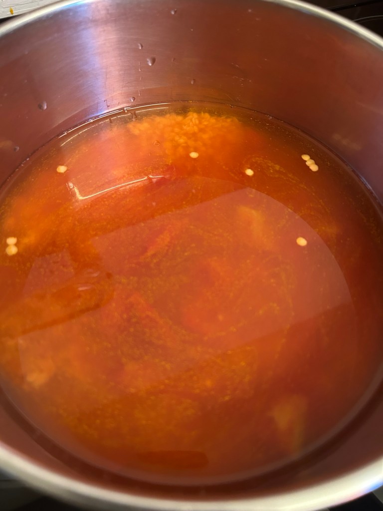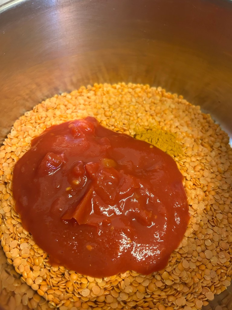 In a decent sized pan, add the lentils, chopped tomatoes and turmeric. Cover with 750ml of cold water and stir.