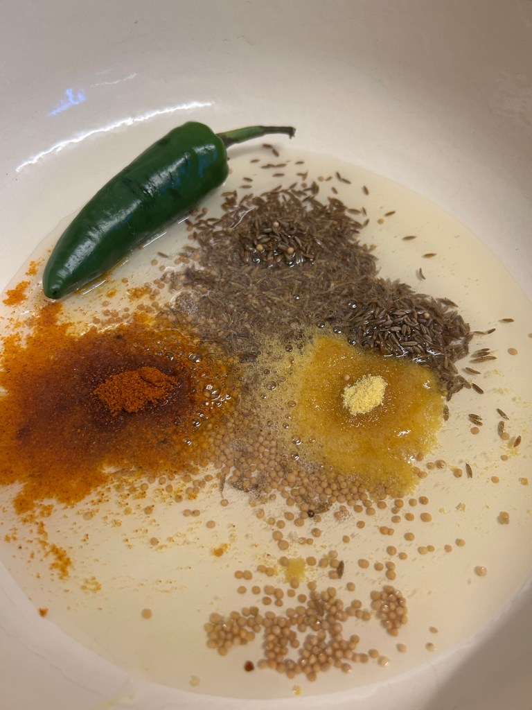 In a large pan, heat the vegetable oil. When it’s hot add the cumin seeds, asafoetida, mustard seeds, pierced green chilli & chilli powder. Fry these for 30 seconds or so flavouring the oil. The kitchen will smell amazing !