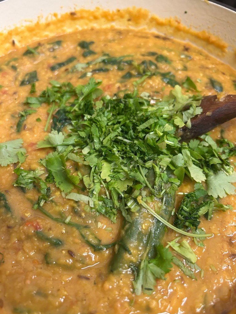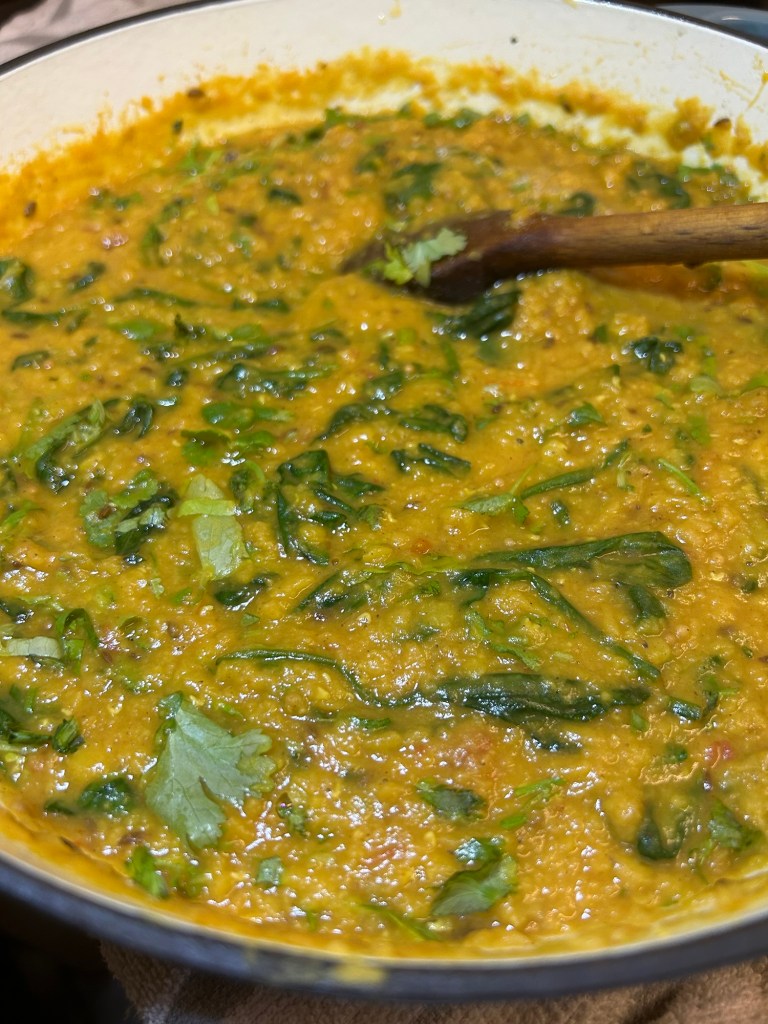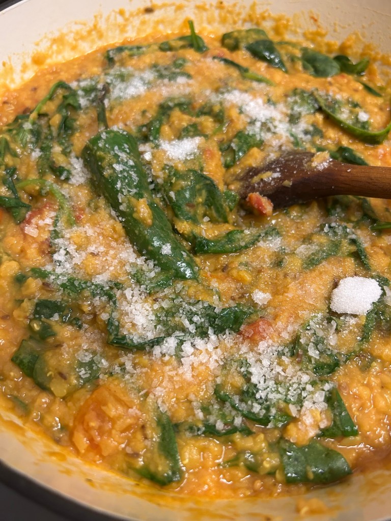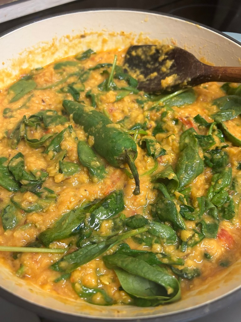 Once all the lentils are in the flavours oil add your spinach. Spinach does make me laugh, it thinks it’s the hardest leafs out there! Stays big and solid then all of a sudden….crumbles 😂