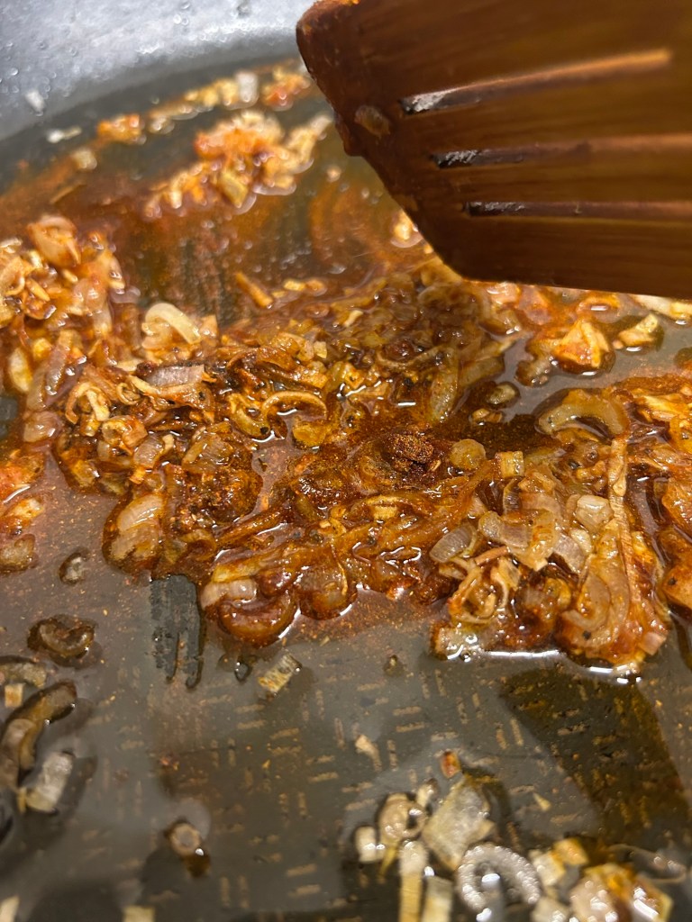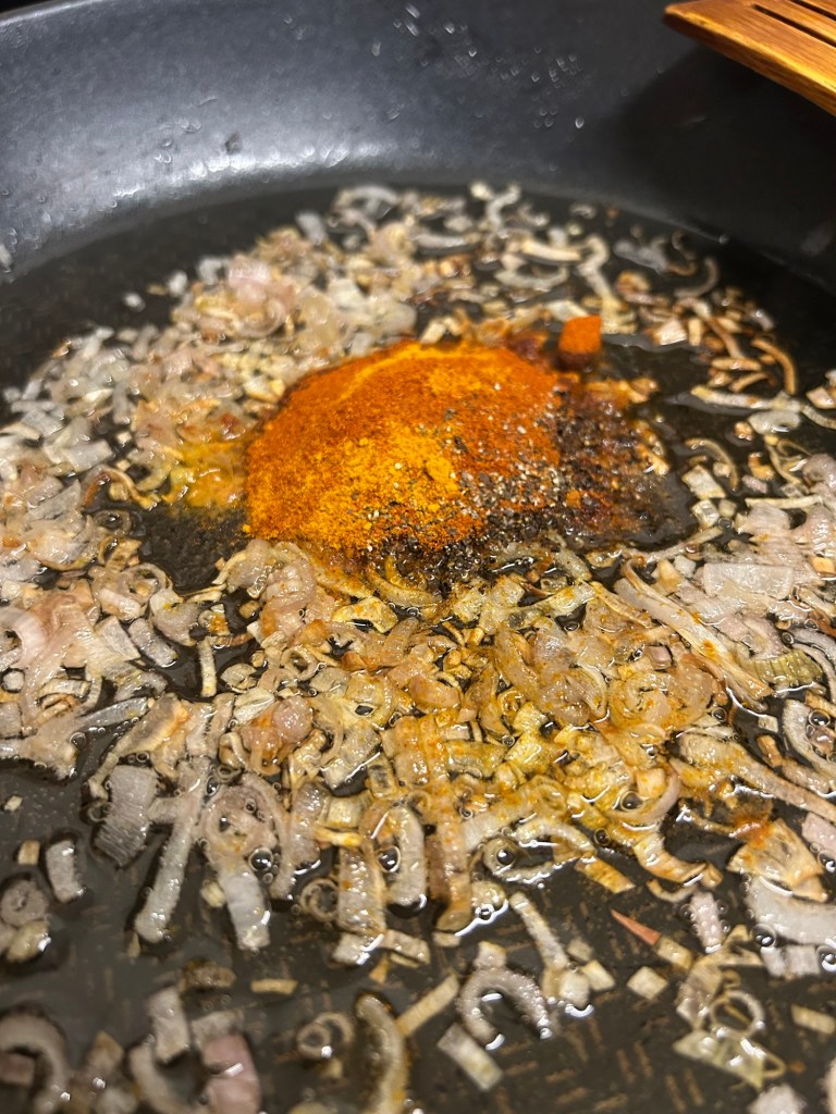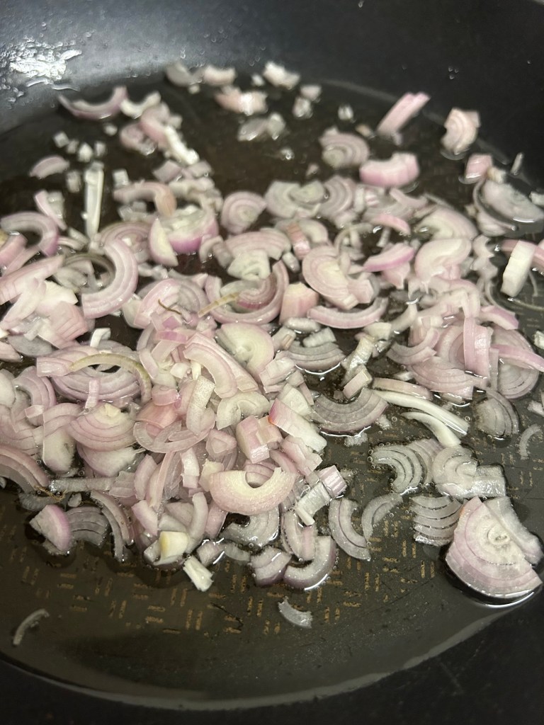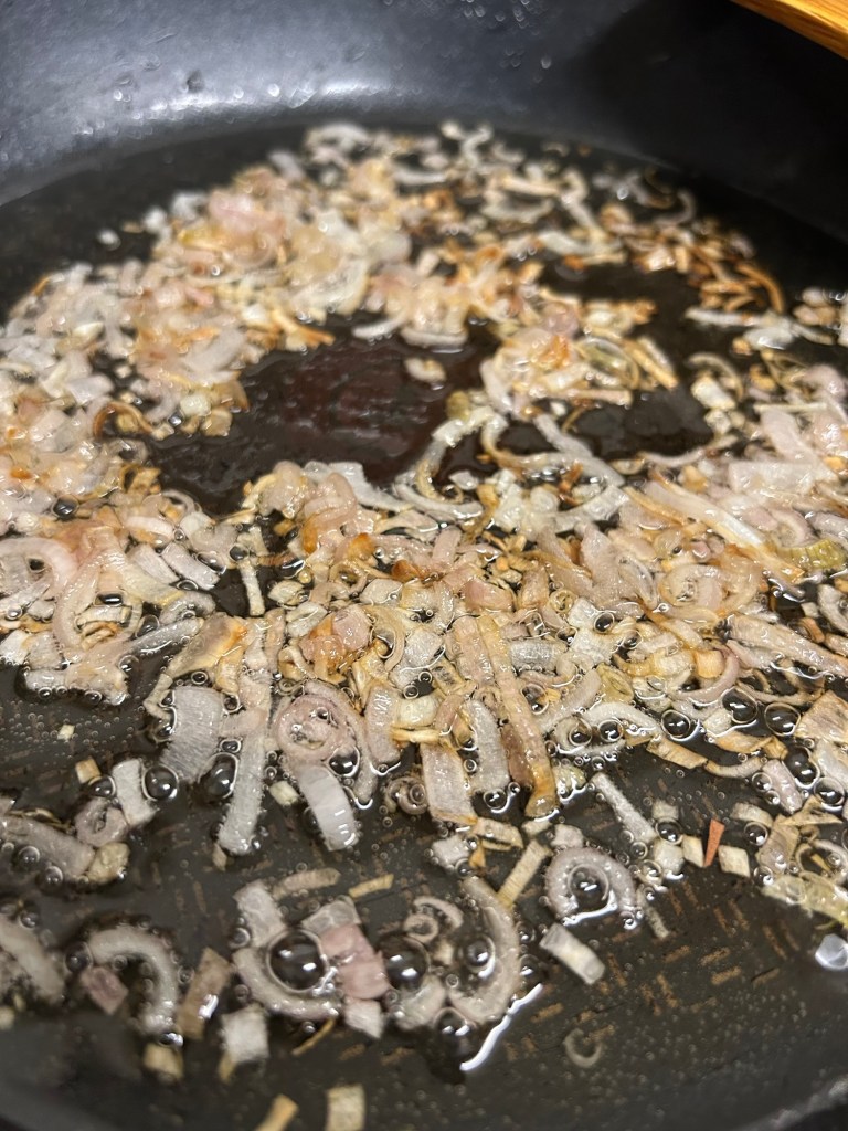 Stir fry the shallots until the my brown slightly and remove from the heat.