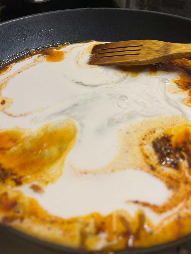 Give the can of coconut milk a good shake then pour it over your shallot spice mix.