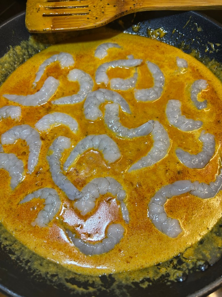 Add your prawns, add the salt and lemon juice. Cook the prawns until they turn opaque.