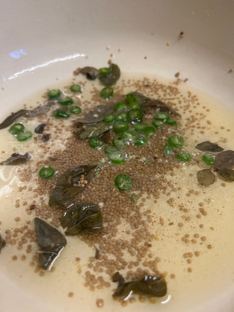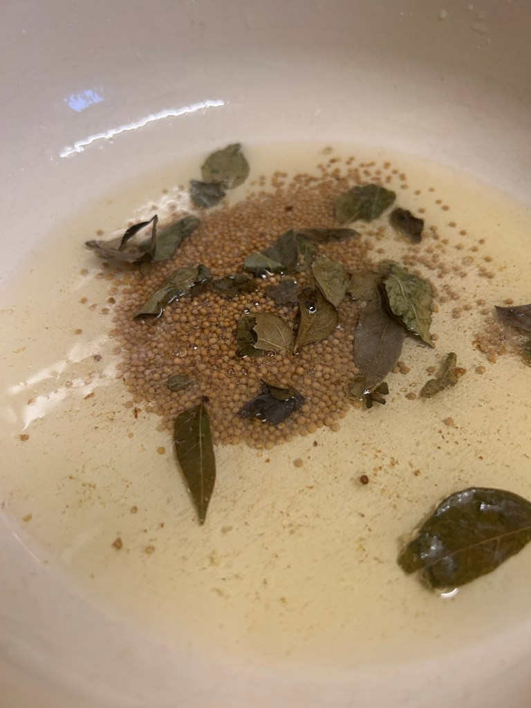 Keep the pan on the heat. Add in the mustard seeds and curry leaves. Cook until the mustard seeds start to pop and crackle.