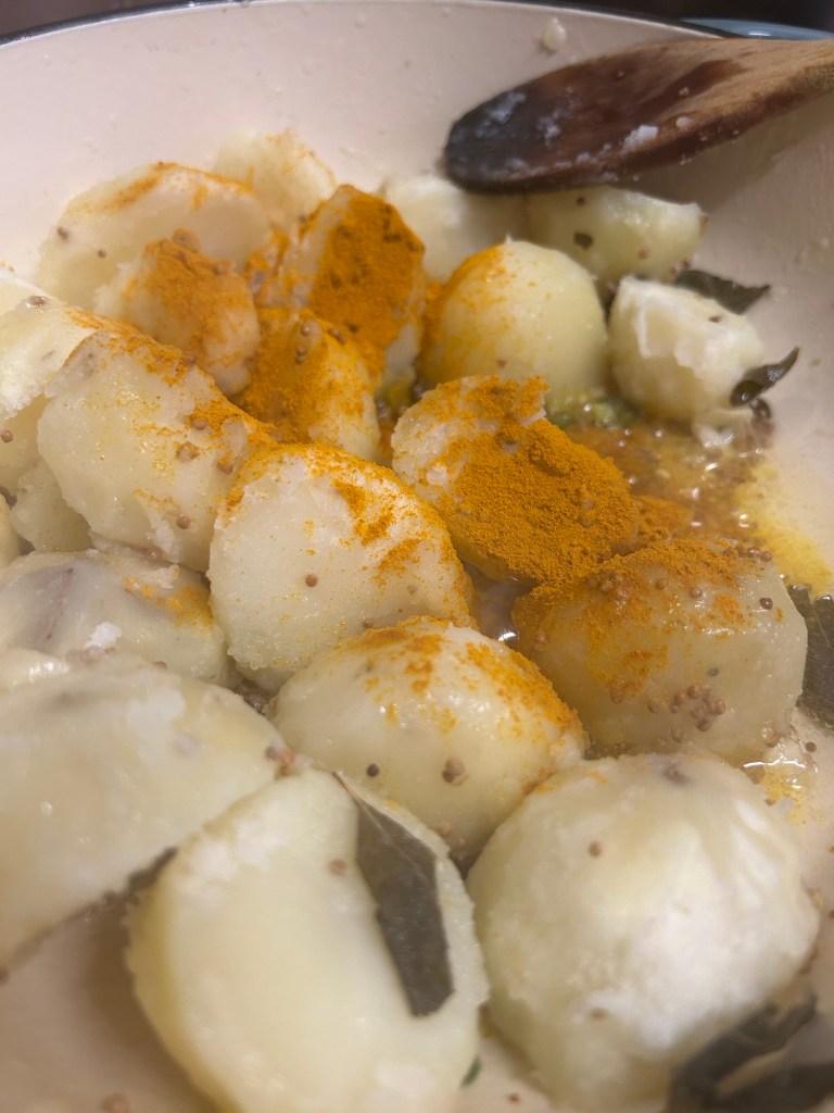 Now we start to build the dish. Add in the par-boiled potatoes. Give them a good stir in pan.