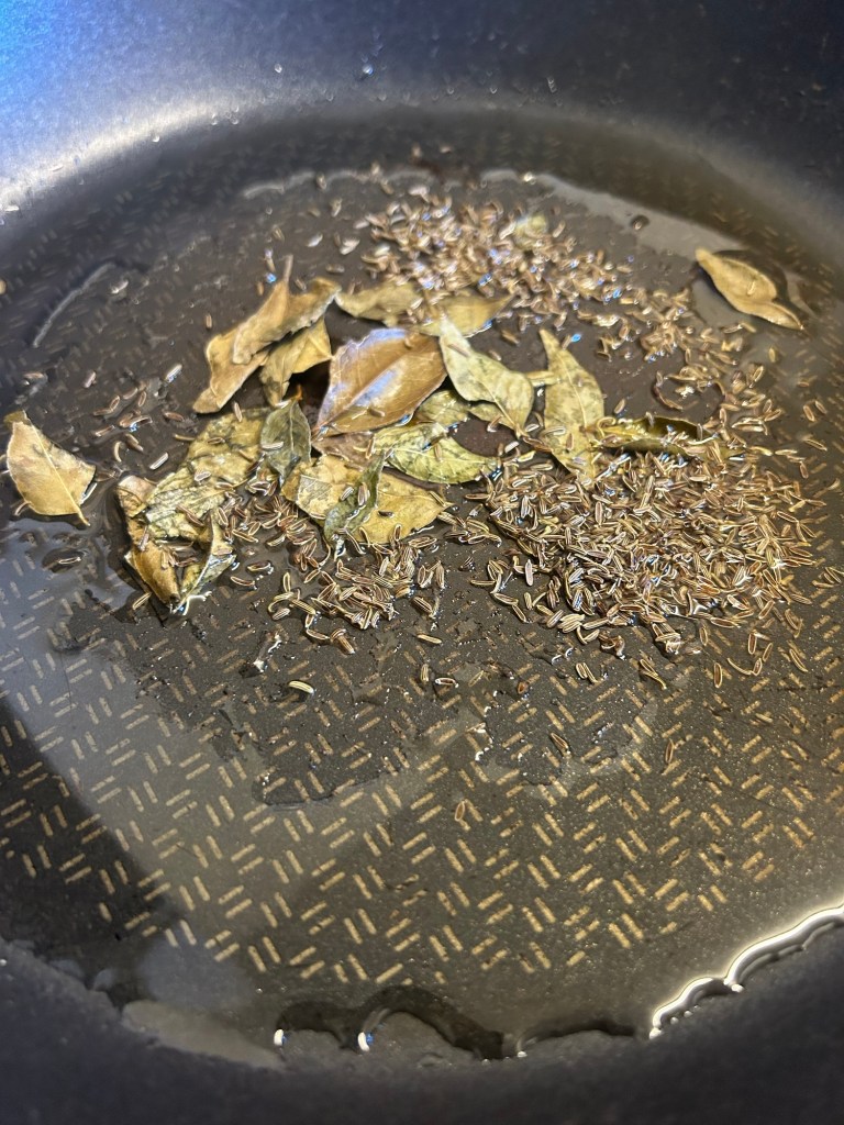 Heat in a frying pan the vegetable oil. Once the oil if hot add the cumin seeds & curry leaves. Fry these for about 30 seconds, the kitchen will become nice a fragrant.