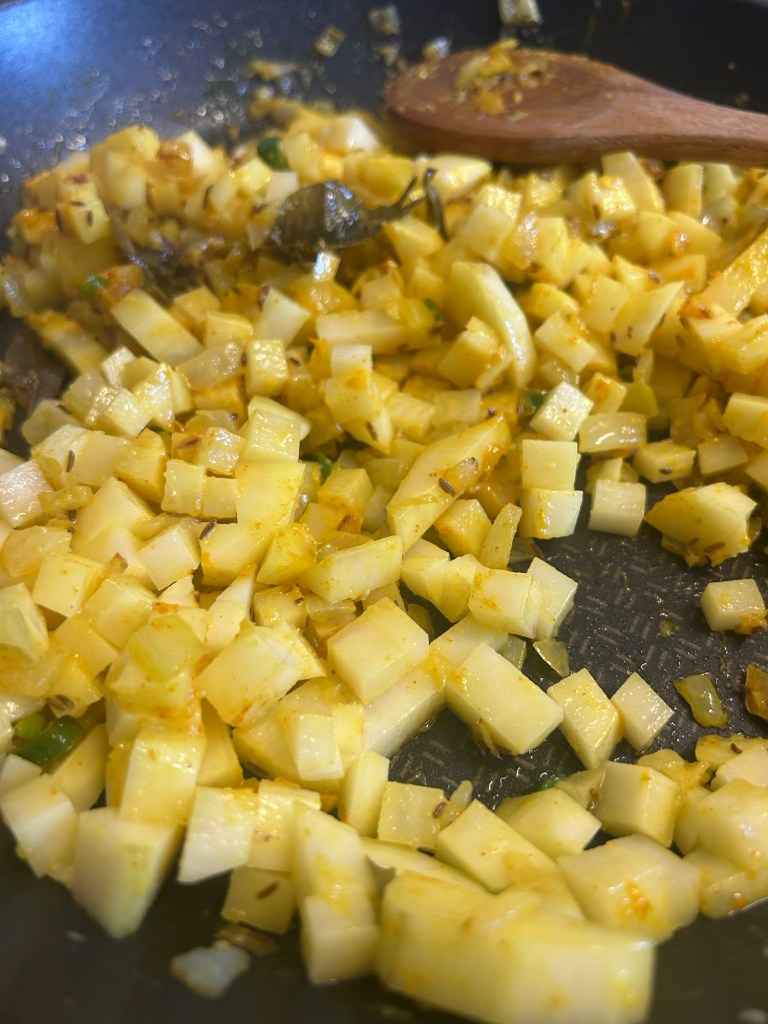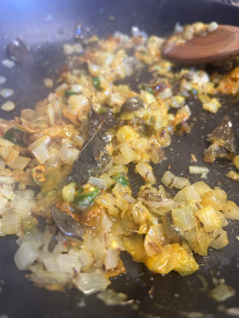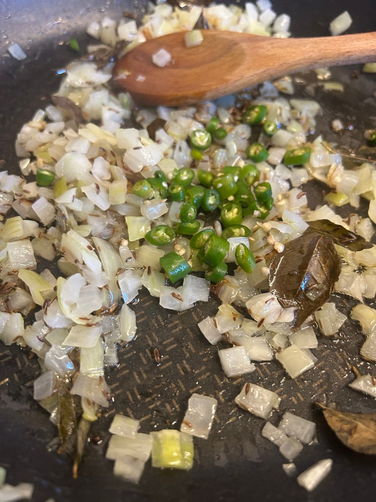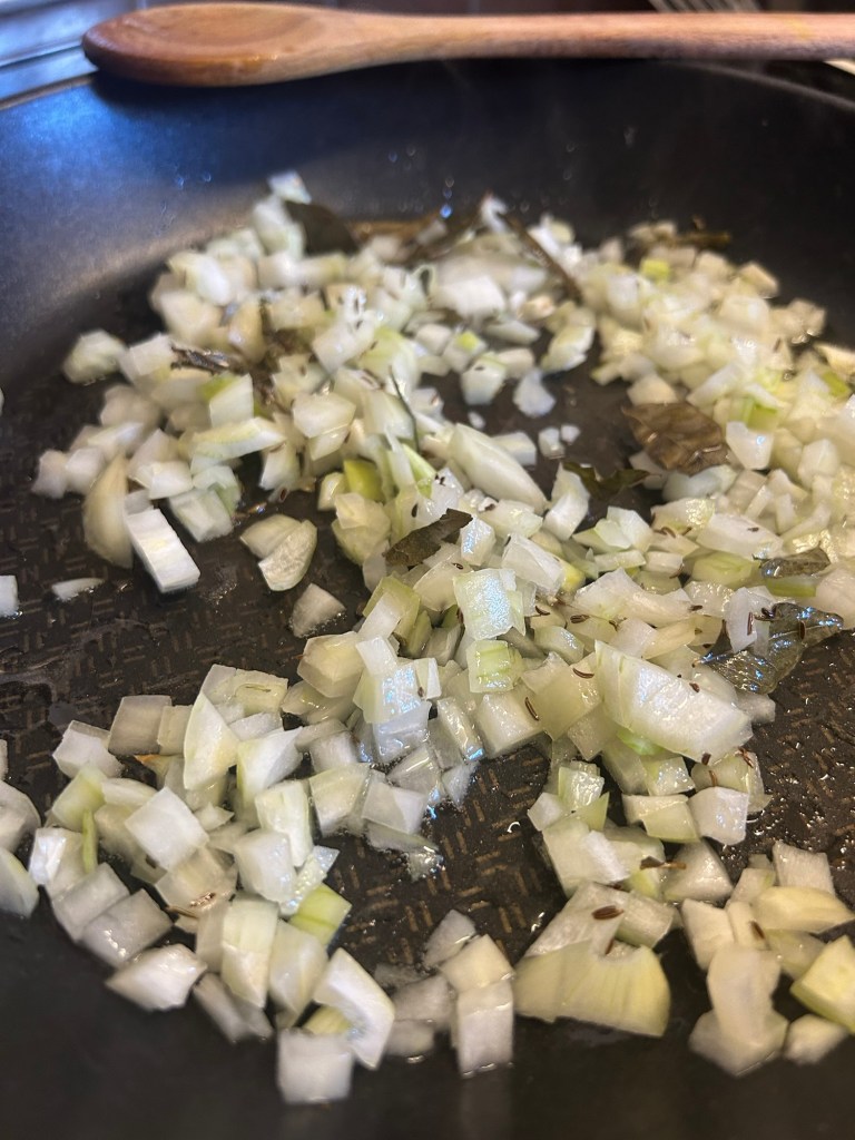 Add 30 seconds of the cumin seeds sizzling away toss in the chopped onion. Fry these together for 5 minutes or so. You want the onions to take on the flavours of the cumin seeds and become nice and translucent.