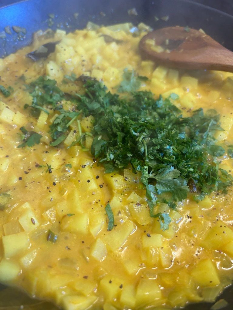 Remove from the heat, add in the chopped coriander with the salt and pepper. Give the pan a good stir and set aside to cool slightly.