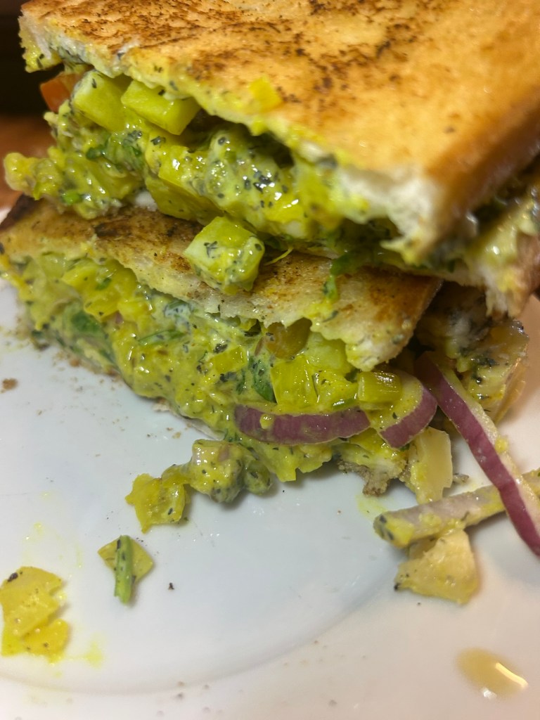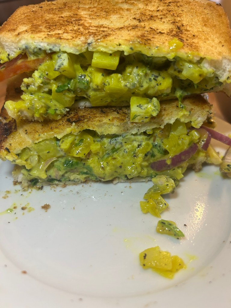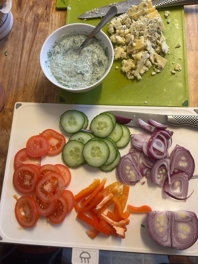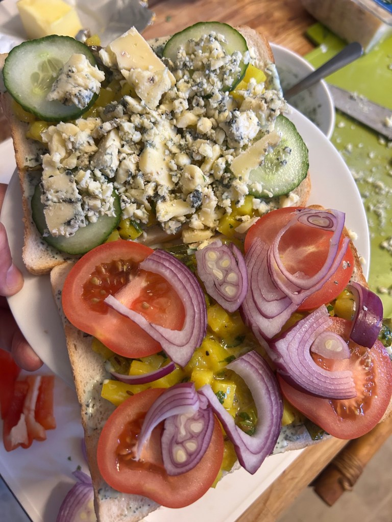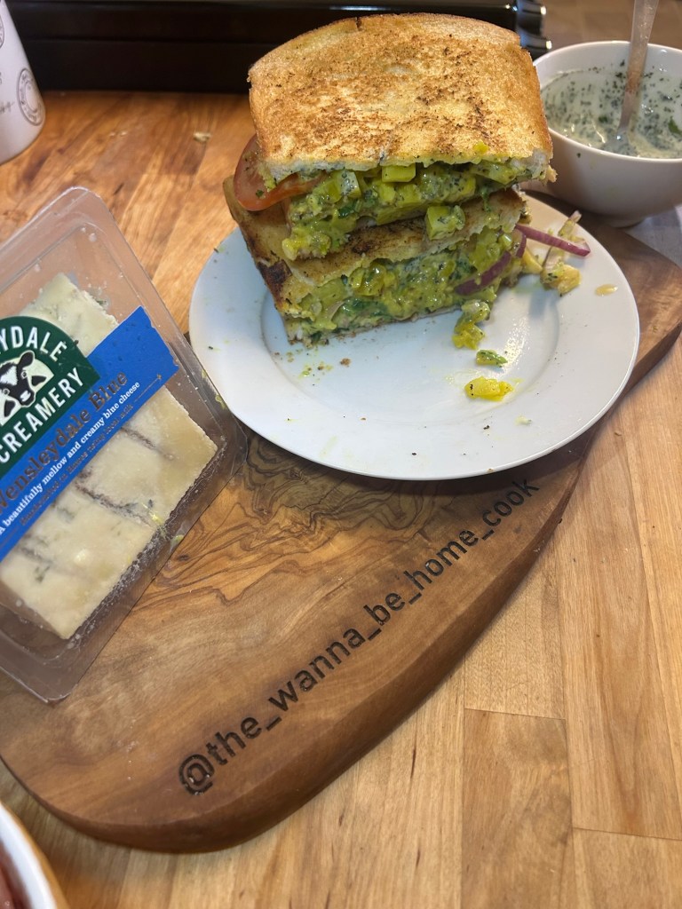Have all your ingredients sliced and ready. Mix the yogurt, mint sauce and coriander together. Spread the minty yoghurt on both sides of your bread. Spread over the potato mixture on both sides. Then layer tomatoes pepper one side and cucumber and red onions the other. Add the cheese. I used blue cheese due to the intense flavour it gives.