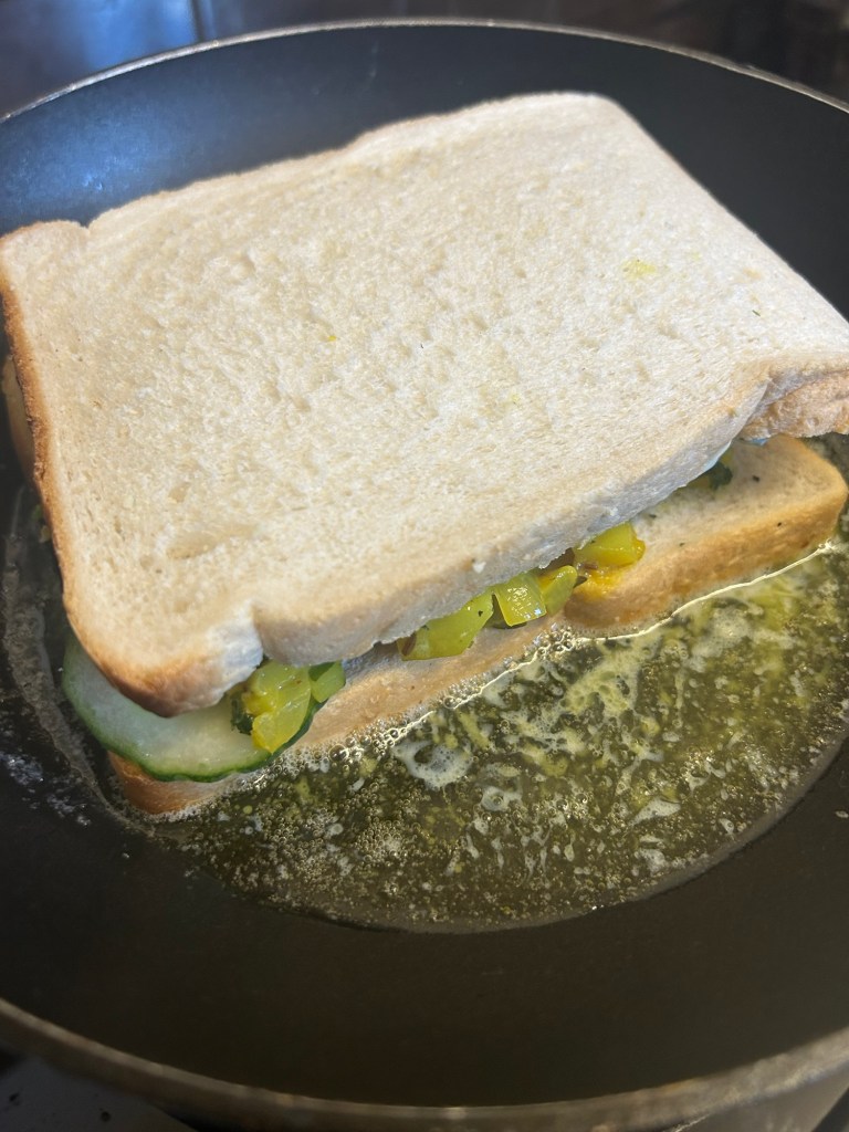 Then in quick succession, you start to build the flavours of your toastie. Add in the chopped green chilliesā¦ā¦