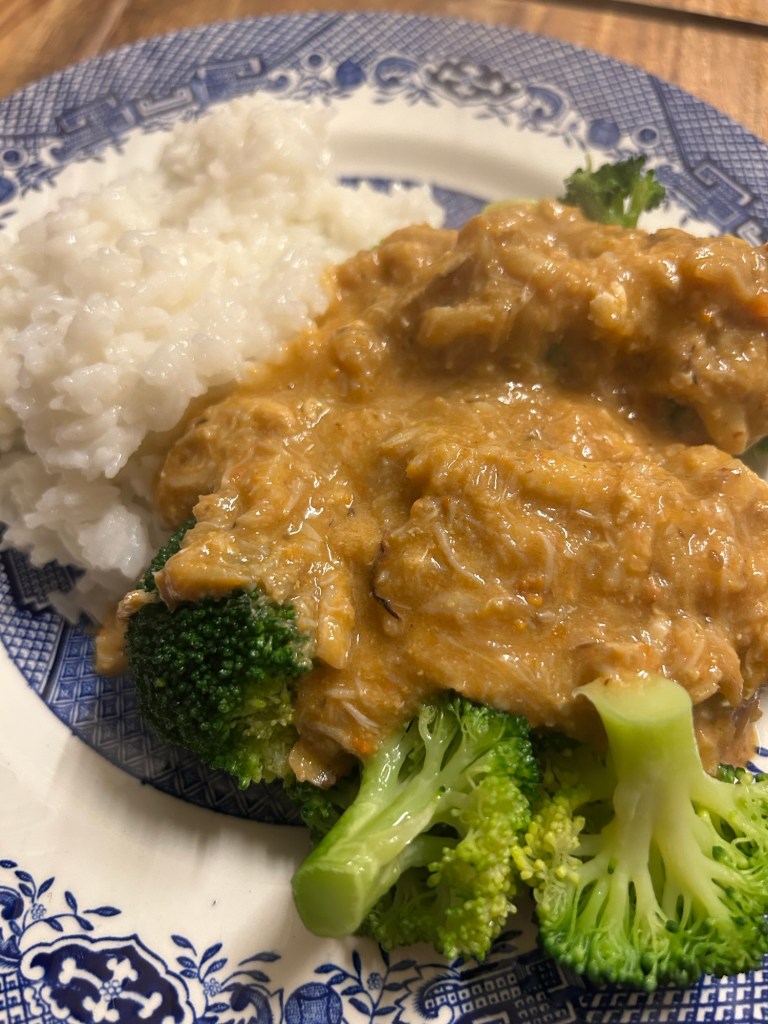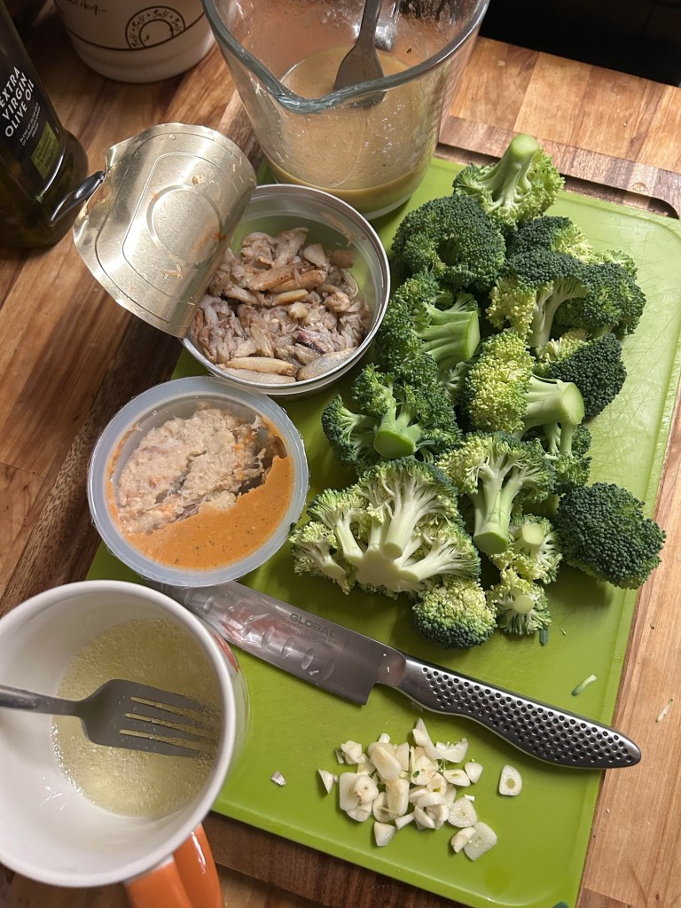 Plate up your jasmine rice, then pour over the crab sauce over the broccoli.
