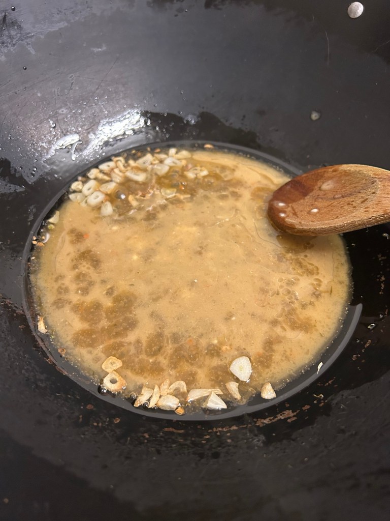 As you’re doing so heat the rest of the vegetable oil in a wok. Once it’s. Nice and hot add in your diced garlic and stir fry for 3 minutes.