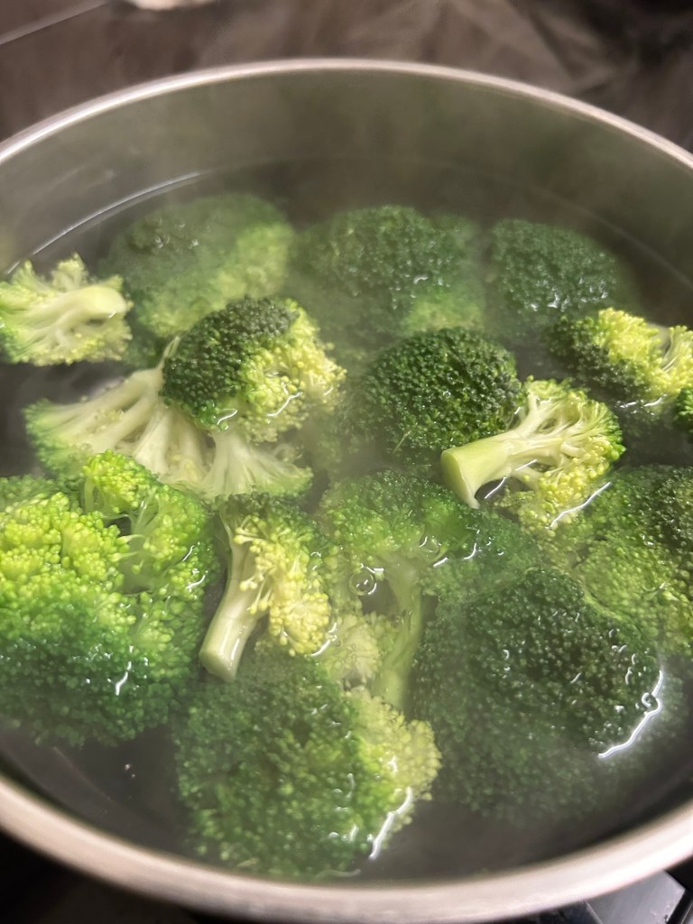 Bring a sauce of water to the boil. Add in 1/2 tsp of salt, 1/2 tsp of sugar, 1/2 of the vegetable oil to a nice simmer. Once simmering add in the broccoli florets, I love how they go a really vibrant green colour. Cook for just over a minute. Drain and place on your serving plate.