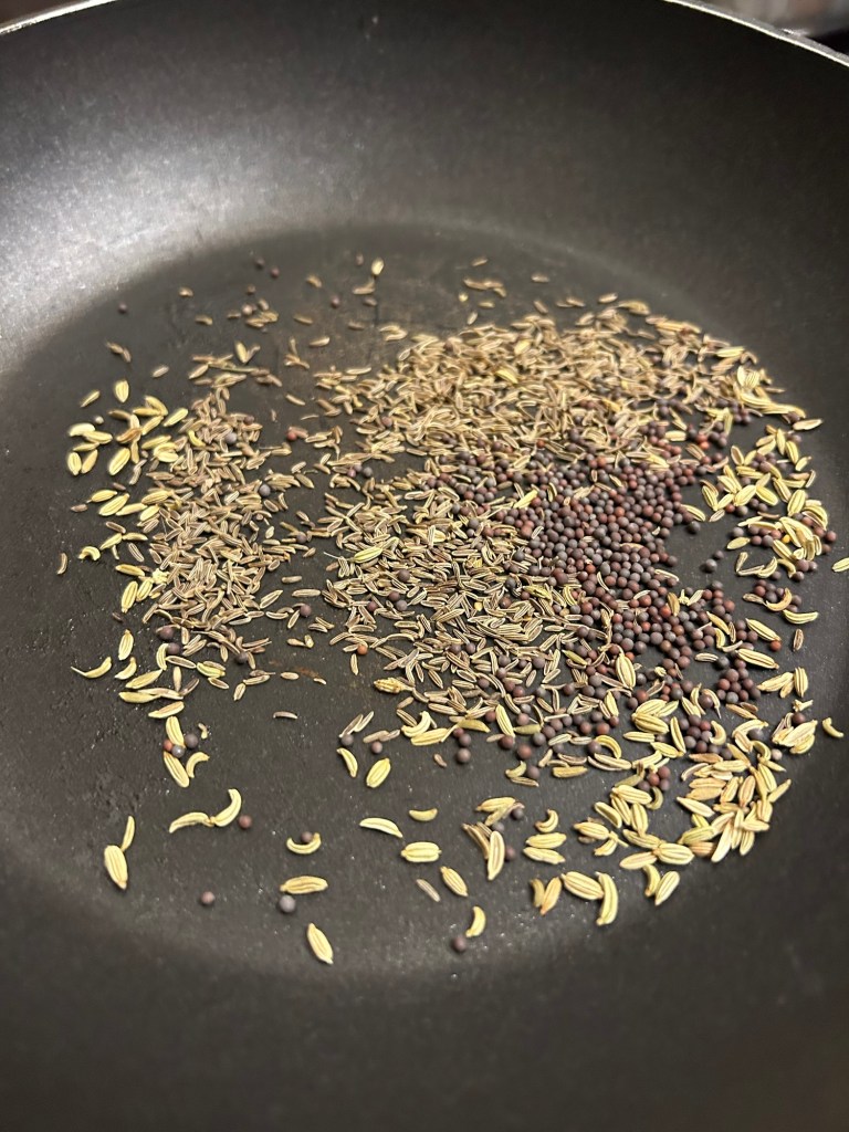 Add the whole spices – cumin seeds, mustard seeds & fennel seeds into a dry frying pan and gently toast them for a minute or two then take off the heat and set aside.