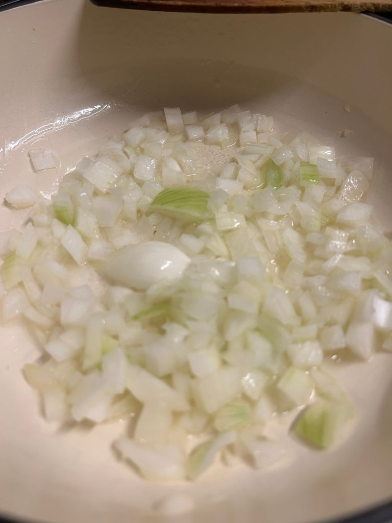 Heat the sunflower oil in a heavy based pan (with a lid). Once hot add the diced onion and gently fry for 5 minutes or so until it’s nice and translucent.