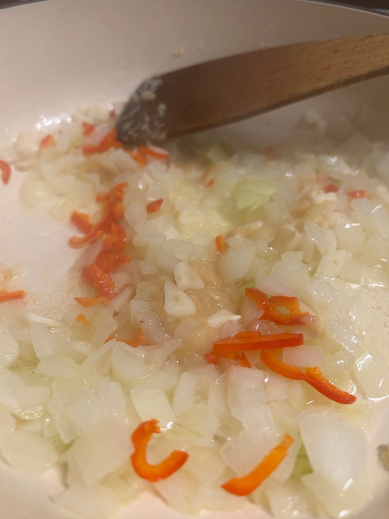 Once you’re happy with the onions add in the garlic, ginger & diced chilli and cook for another 3 minutes stirring the pan.