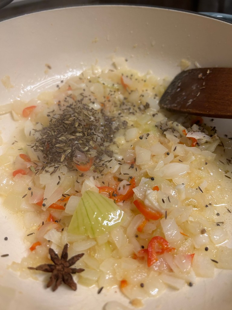 Now it’s time to build the flavours. Add the dry roasted seeds (keep the frying pan) and the star anise. Mix well and fry for another 2 minutes, the kitchen will start to smell heavenly.