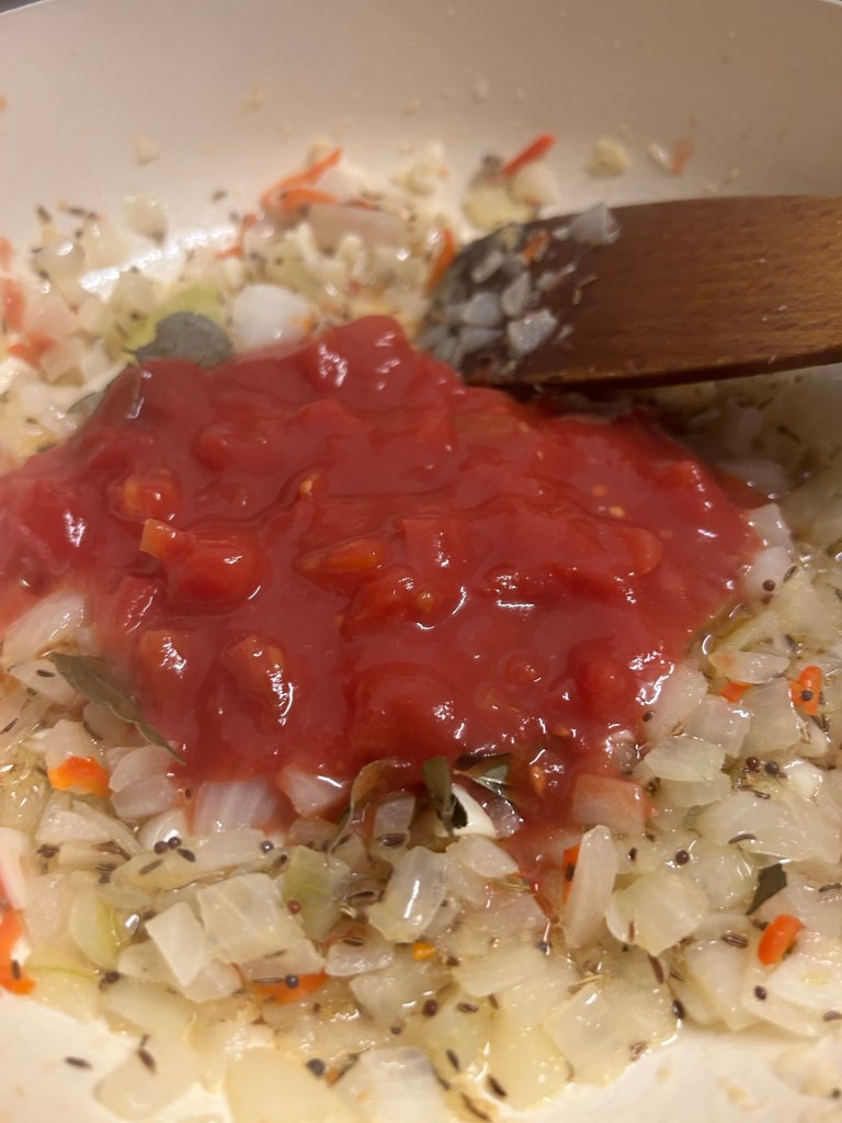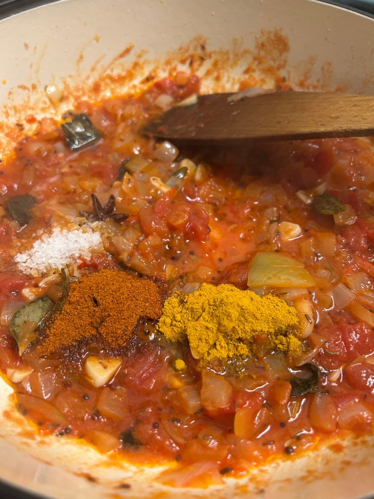 Then add the chopped tomatoes and curry leaves. At this point I also added a splash of water. Mix well and simmer for 5 minutes.