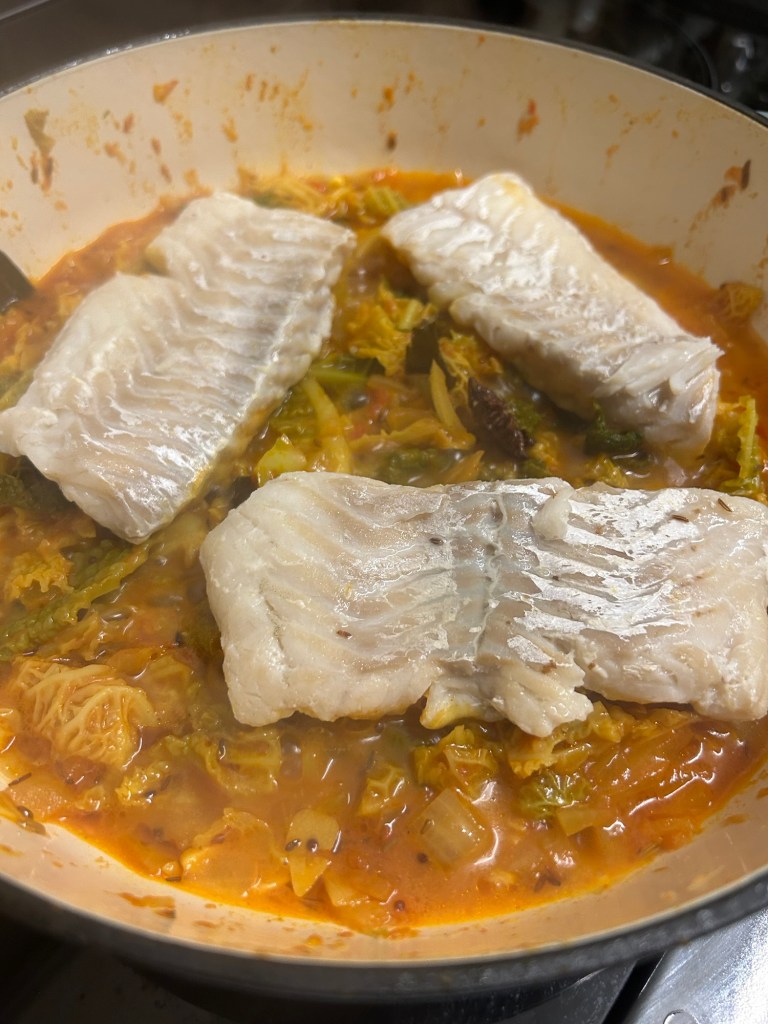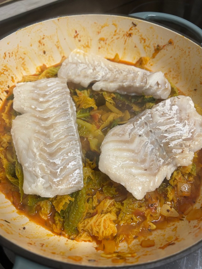 The recipe is a modified version of a dish by ‘Mother India’ whom I discovered during a work trip to Glasgow. The original recipe used halibut, but living in the middle of England finding this well sort after fish in the supermarkets / fish mongers is very hard, plus it’s a very expensive piece of fish.