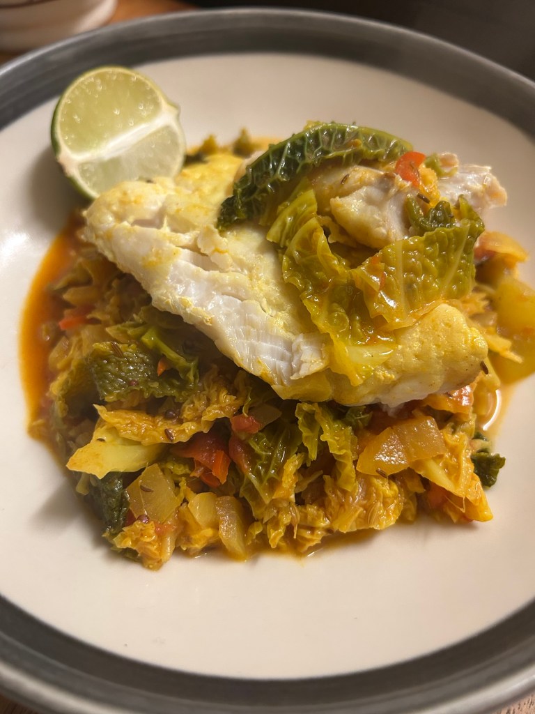 Gently remove the fish to a separate plate. Plate up your spiced cabbage and rice then lay the fish back on top of the cabbage and serve with a piece of lime.